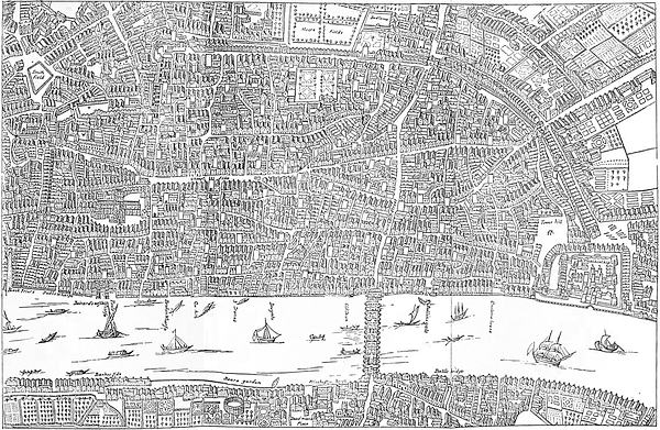 By the river bank among wharves and quaint mediæval warehouses, St. Magnus’ steeple, the stern towers of Baynard’s Castle, and the buildings of the Blackfriars are conspicuous; while in the same direction, and beyond the Fleet river, is Bridewell Palace, the huge tower of the Whitefriars, the Temple, St. Dunstan’s Church, Exeter House, Arundel House, the Savoy, and York Place. Along the eastern limits of the City are St. Dunstan’s, St. Margaret Pattens, All Hallows Barking, the great Minster of the Friars of the Holy Cross, and the still larger Priory of the Holy Trinity in Aldgate.18 Near Bishopsgate is the large establishment of the Augustinians, and beyond this again the Grey Friars, the Priory of St. Bartholomew, the Charter House, and the Priory of St. John, Clerkenwell. In the centre of the City is an almost endless array of parish churches, with here and there the high-pitched roof of some guild house, or the residence of a nobleman or wealthy merchant.