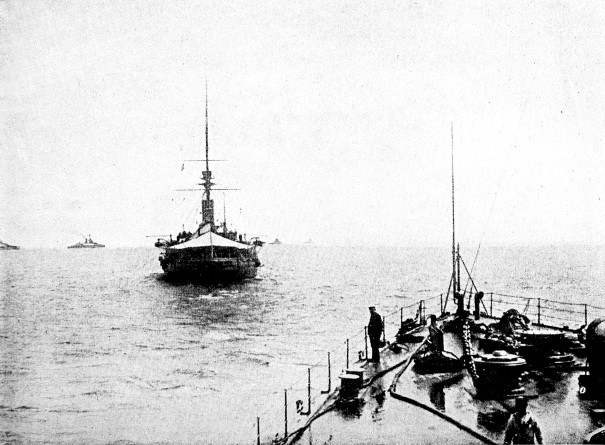 The blockade maintained through the winter at the Strait of Otranto was exceedingly arduous and filled with peril. Enemy destroyers and submarines were at work, issuing from the wonderful island fringe of the Dalmatian coast, and the French knew their peril. The armoured cruiser Léon Gambetta was32 sunk by submarine attack, with the loss of Rear-Admiral Sénès, who was in command, and every officer on board, as well as nearly 600 men. The armoured cruiser Waldeck-Rousseau suffered damage by torpedo, and the new Dreadnought Jean Bart, with Admiral Boué de Lapéyrère, the French Admiralissimo of the combined fleets, on board, was touched, though only slightly injured. There were other submarine attacks and losses of small craft, and some losses were inflicted upon the enemy. British cruisers were attached to the French Flag during these operations, and they continued to co-operate with the French and Italians in Adriatic waters and in the Ægean, where the French and Allied naval forces were the guard of all the operations at Salonika and in the Piræus. Fleets and armies have co-operated in the Mediterranean from the very beginning of the war. In May, 1917, the British monitors, which, with the converted cruisers, had been operating with the military expedition against the Turks and Bulgarians, appeared in the Adriatic, and rendered valuable aid to the Italians in their advance towards Trieste. The naval coalition has been a marvel of effective organisation.