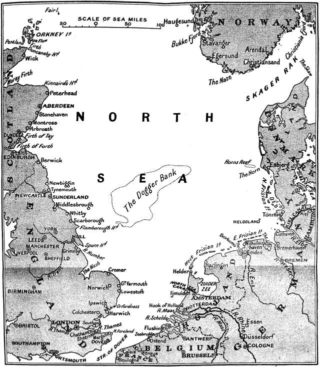 Of all the theatres of the war, on sea or land, the North Sea is the most important. It is vital to all the operations of the Allies. Command of its waters and its outlets is the thing that matters most. In that sea is the centre of naval influence. It is the key of all the hostilities. From either side of it the great protagonists in the struggle look at one another. There the great constriction of the blockade is exerted upon Germany. It is the mare clausum against which she protests. Geography is there in the scales against her. She rebels against British sea supremacy. The “freedom of the seas” is, therefore, her claim—though she is endeavouring to qualify to be the tyrant of them. Her only outlook towards the outer seas is from the Bight of Heligoland and the fringe of coast behind the East Frisian Islands, or from the Baltic, if her ships pass the Sound or the Belt, issuing into12 the North Sea through the Skager-Rak. But they cannot reach the ocean, except through the North Passage, where the Grand Fleet holds the guard. Only isolated raiders, bent upon predatory enterprise, have stealthily gone that way after nightfall. At the southern gate of the North Sea, through the Straits of Dover and in the Channel, the way is barred. The guns of Dover, the Dover Patrol, and certain other deterrents forbid the enemy to adventure in that direction.