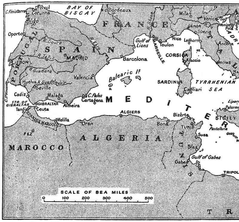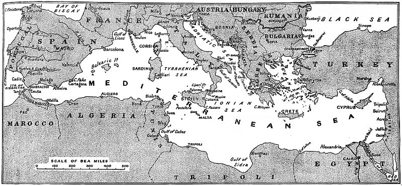 It is important next to consider the situation in the Mediterranean, where sea-power is of momentous importance to the Allies. In those historic waters the fate of many nations has been decided. They are a vital link and the highway of the British Empire. Between Gibraltar and Port Said two thousand miles of British welfare lie outrolled. To France, with her great possessions in Algeria, Morocco, and Tunis, the importance of this sea highway is supreme. She must, in this war and at all times, traverse its waters or she will be undone. Italy has won a great position In the Adriatic and the Mediterranean, and she would wither away and perish if either fell under enemy control. Trieste is her object, and she has proclaimed a protectorate over Albania the better to establish her power in the Adriatic, and she has her30 new possessions in the Libia Italiana of Northern Africa. From the operations in the Mediterranean we shall learn something more of the relation of sea-power to land operations, and of the limitations of that power, and we shall see the allied navies of England, France, Russia, Italy, and Japan in co-operation. We shall know why the enemy made a great submarine stroke in the Mediterranean when everything else at sea had failed.