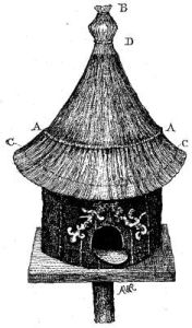 The bark that covers the can is one inch less in height than the can, so as to allow the upper rim to remain bare. Into this circle of projecting tin holes are punched one inch apart all around the rim. These holes are made use of when stitching the straw roof to the rim of the can, as shown at A A. To give greater strength and stiffness to the roof, a second circle of stitches is taken at C C, and a third at D, and a fourth at B, to prevent the straws from spreading. The bird-house is now ready for fastening in position on the platform either with screws or nails.