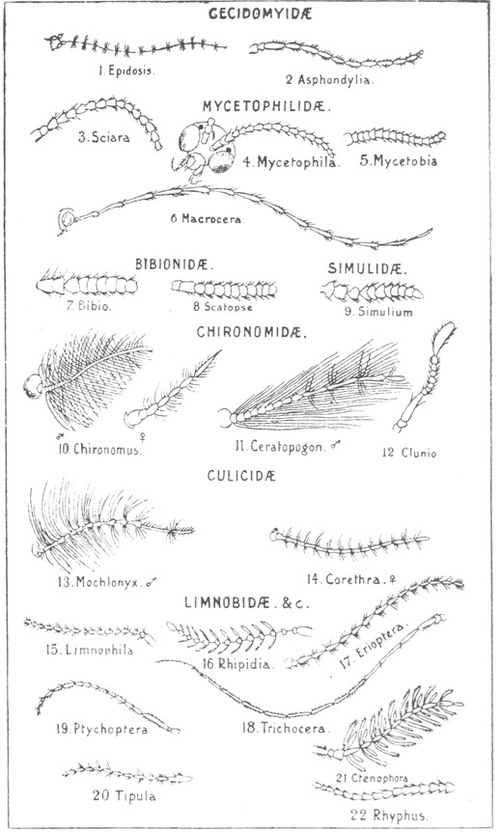 The first sub-division, Diptera Orthorrhapha, comprises those flies which in the stage of the pupa or chrysalid disclose the outline of the perfect insect; in the other sub-division, Diptera Cyclorrhapha, there are grouped together all those flies of which the larvæ make for themselves a puparium or barrel-like case out of their larval skin.