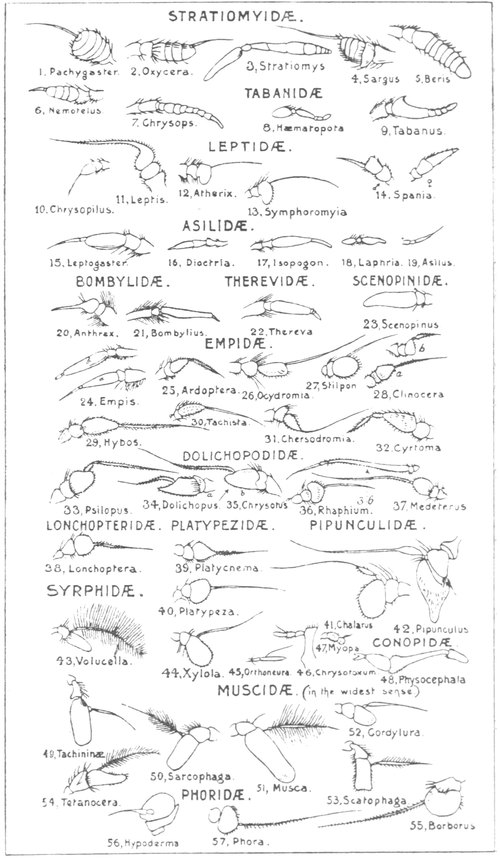 Omitting Aphides (green-flies, plant-lice, and the like) which are an "order" by themselves, and excluding gnats of slim form, mosquitoes, and midges, which are mainly crepuscular, nocturnal, or shade frequenting, we might try unscientifically to sub-divide the more conspicuously sunshine-loving and day-flying flies into:—(1) flower and honey seeking flies; (2) cattle pestering sweat-flies; (3) skin-piercing, blood-sucking flies; (4) insectivorous flies; (5) fungus flies; (6) carrion and filth flies; and to these must be added another small group (7) which comprises those of the wondrous family of the Œstridæ, the most horrible though not the most injurious of the animal persecuting and torturing flies; this last group, strange to say, are absolutely destitute of any mouth and feed only in the maggot stage. In many cases, however, it happens that the males and the females differ in feeding habits as well as in colours and markings, whilst only their patterns of wing-veins and some less prominently apparent features are constant in the two sexes. These circumstances discountenance the above grouping.