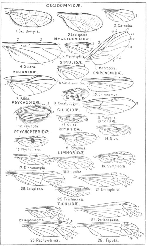 In the accompanying illustrations rather similar patterns of wings are shown; these are typical of the Muscidæ and Anthomyidæ, which, taken together, comprise amongst others all the cattle and human pestering "sweat-flies"; only a few really blood-sucking flies are included amongst the Muscidæ.