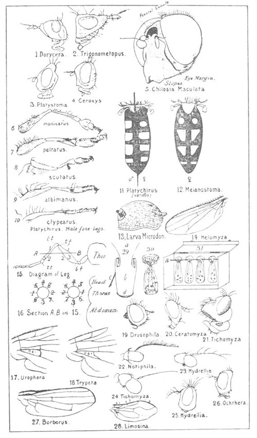 Again, if we tried to group our flies with adequate regard to their very diverse habits of life, in the larval stage as well as to their subsequent metamorphoses, we should find that these are details which are obscure and in many cases unknown or imperfectly recorded. However, after much study and many revisions, a scientific classification has been contrived based upon the minutely differentiated characteristics which are technically explained in the Appendix to this booklet.