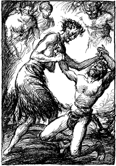 Der feurige Loki aber sprang vor, riß sie an seine Brust, daß sie taumelnd die Glut seines Herzens spürten, ließ einen Blutstropfen in sie überspringen und gab die Menschgewordenen aus seiner brünstigen Umarmung frei.