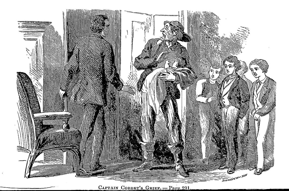 At this menacing and imperative summons there came a response. It came in the shape of a figure that stole forward in front of the doorway, slowly and carefully; a figure that disclosed to their view the familiar form, and the meek, the mild, the venerable, and the well-remembered face of Captain Corbet! Greeted with one universal shout of joy.
