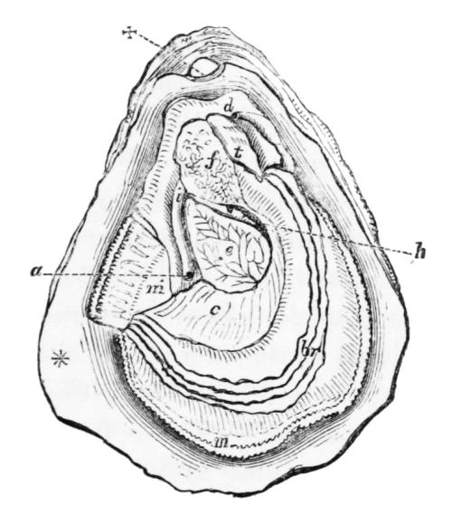 By means of the beard or mantle described (m), the oyster secures his food, bringing it gradually, by means of little hooks bent inwards, to its mouth (b), wherein it is crushed and slowly consumed.