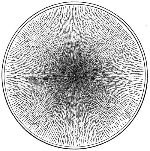 Turning from cast-iron to other metals we find further manifestations of this expansive solidification. Bismuth is a notable example. In his lectures on Heat, Dr. Tyndall exhibited an experiment in which a stout iron bottle was filled with molten bismuth, and the stopper tightly closed. The whole was set aside to cool, and as the metal within 24 approached consolidation the bottle was rent open by its expansion, just as would have been the case had the bottle been filled with water and exposed to freezing temperature. Mercury affords another example. Thermometers which have to be exposed to Arctic temperatures are generally filled with spirit instead of quicksilver, because the latter has been found to burst the bulbs when the cold reached the congealing point of the metal, the bursting being a consequence of the expansion which accompanies the act of congelation. Silver also expands in passing from the fluid to the solid state, for we are informed by a practical refiner that solid floats on molten silver as ice floats on water; it also, as likewise do gold and copper, exhibits surface converging currents in the melting-pot like those depicted above for molten iron.