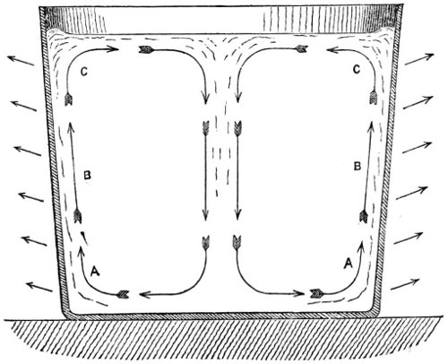Now if we carefully consider this peculiar action and seek a cause for the phenomenon, we shall be led to the conclusion that it arises from the expansion of that portion of the molten mass which is in contact with or close proximity to the comparatively cool sides of the ladle, which sides act as the chief agent in dispersing the heat of the melted metal. The motion of the scoria betrays that of the fluid metal beneath, and careful observation will show that the motion in question is the result of an upward current of the metal around the circumference of the ladle, as indicated by the arrows A, B, C in the accompanying sectional drawing 23 of the ladle (Fig. 2). The upward current of the metal can actually be seen when specially looked for, at the rim of the pot, where it is deflected into the convergent horizontal direction and where it presents an elevatory appearance as shown in the figure. It is difficult to assign to this effect any other cause than that of an expansion and consequent reduction of the specific gravity of the fluid metal in contact with or in close proximity to the cooler sides of the pot, as, according to the generally entertained idea that contraction universally accompanies cooling, it would be impossible for the cooler to float on the hotter metal, and the curious surface-currents above referred to would be in contrary direction to that which they invariably take, i.e., they would diverge from the centre instead of converging to it. The external arrows in the figure represent the radiation of the heat from the outer sides of the pot, which is the chief cause of cooling.