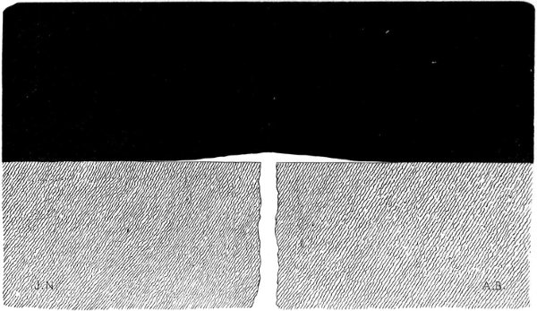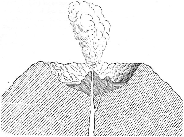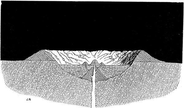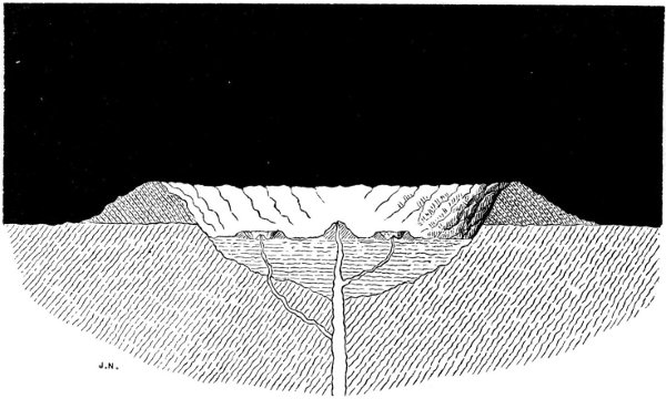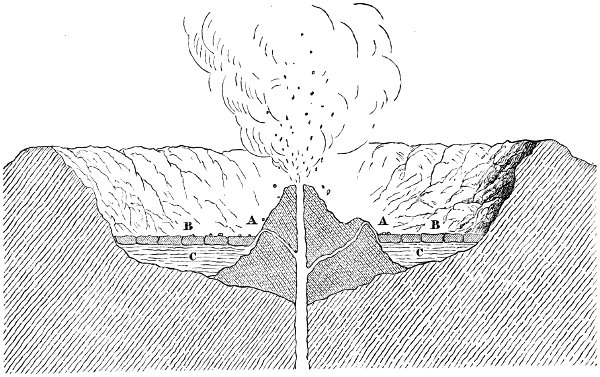 Here then we have a substance closely allied to volcanic material which manifests the expansile principle in question; but we may go still further and give evidence from the very fountain-head by instancing what appears to be a most cogent example of its operation which we observed on the occasion of a visit to the crater of Vesuvius in 1865 while a modified eruption was in progress. On this occasion we observed white-hot lava streaming down from apertures in the sides of a central cone within the crater and forming a lake of molten lava on the plateau or bottom of the crater; on the surface of this molten lake vast cakes of the same lava which had become solidified were floating, exactly in the same manner as ice floats in water. The solidified lava had cracked, and divided into cakes, in consequence of its contraction and also of the uprising of the accumulating fluid lava on which it floated, more and more space being thus afforded for it to separate, on account of the crater widening upwards, while through the joints or fissures the fluid lava could be seen beneath. But for the decrease in density and consequent expansion in volume which accompanied solidification, this floating of the solidified lava on the molten could not have occurred. Reference to Fig. 3, 26 which represents a section of the crater of Vesuvius on the occasion above referred to, will perhaps assist the reader to a more clear idea of what we have endeavoured to describe. A A are the streams of white-hot lava issuing from openings in the sides of the central cone, and accumulating beneath the solidified crust B B in a lake of molten lava at C C; the solidified crust B B as it was floated upwards dividing into separate cakes as represented in Fig. 4. (See also Plate I.)