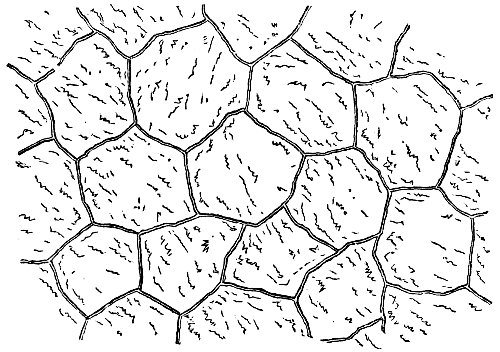 A long-kept shrivelled apple affords an apt illustration of this wrinkle theory; another example may be observed in the human face and hand, when age has caused the flesh to shrink and so leave the comparatively unshrinking skin relatively too large as a covering for it. We illustrate both of these examples by actual photographs of the respective objects, which are reproduced on Plate II. Whenever an outer covering has to accommodate and apply itself to an interior body that has become too small for it, wrinkles are inevitably produced. The same action that shrivels the human skin into creases and wrinkles, has also shrivelled certain regions of the igneous crust of the earth. A map of a mountainous part of our globe affords abundant evidence of such a cause having been in action; such maps are pictures of wrinkles. Several parts of the lunar surface, as we shall by-and-by see, present us with the same appearances in a modified degree.