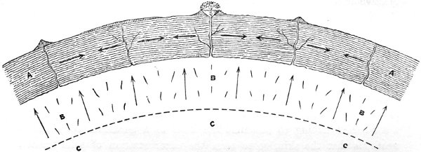 Fig. 5. A A. The solidified crust cooling, contracting, and cracking; the cracking action enhanced by the expansion of the substratum of molten matter, B B B, which, expanding as it approaches the point of solidification, injects portions of the molten matter up through the contractile cracks, and results in producing craters, mountains of exudation, and districts flooded with extruded lava, C C C. The nucleus of intensely hot molten matter.