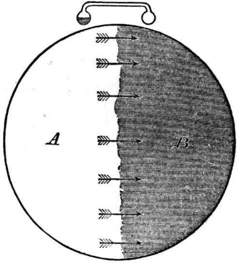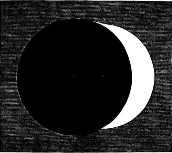 It might happen at “full-earth,” that a black spot with a fainter penumbral fringe would appear on one side of the illuminated disc and pass somewhat rapidly across it. This would occur when the moon passed exactly between the sun and the earth, and the shadow of the moon was cast upon the terrestrial disc. We need hardly say that these shadow-transits would occur upon those astronomically important occasions when an eclipse of the sun is beheld from the earth.