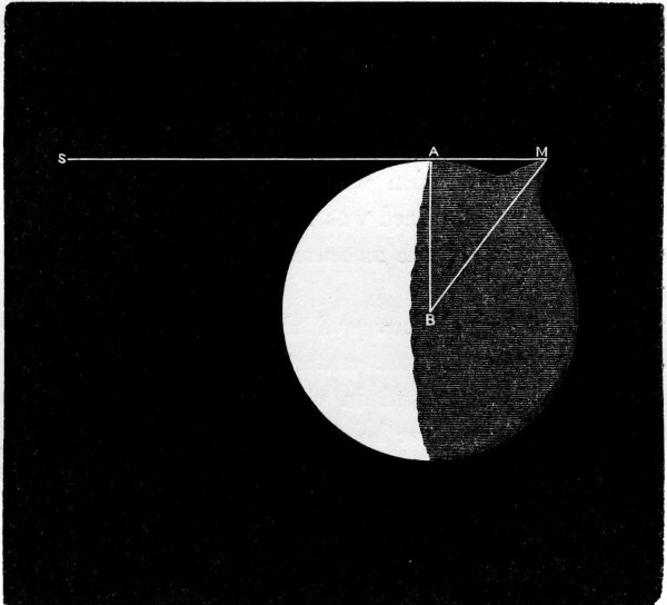 Another of the high functions of the moon is that by which she subserves the wants of the navigator, and enables him to track his course over the pathless ocean. Of the two co-ordinates, Latitude and Longitude, that are needful to determine the position of a ship at sea (or of any standpoint upon the earth’s surface) the first is easily found, inasmuch as it is always equal to the altitude of the celestial pole at the place of observation. But the determination of the longitude has always been a difficult problem, and one upon which a vast amount of ingenuity has been expended. When it was first attacked it was soon discovered that the moon was the object of all others by which it could be most accurately and, all things considered, most readily determined. We must premise that the longitude of one place from another is in effect the difference between the local times at the two places, so that when we say that a place or a ship is, for instance, seven hours, twenty-four minutes, ten seconds, west of Greenwich, we mean that the time-o’-day at the place or ship is seven hours twenty-four minutes ten seconds earlier than that at Greenwich. Hence, finding the longitude at sea or at any place and moment means finding what time it is at Greenwich at that moment. Of course this could be most easily done if we could set a timekeeper at Greenwich and rely upon its keeping time during a long sea voyage; and this plan appeared so feasible that our Government long ago offered a prize of £20,000 for a timekeeper which would perform to a stated degree of accuracy after a certain sea voyage. One John Harrison did make such a timekeeper, that actually satisfied the conditions, and obtained the prize: and chronometers are now largely used for longitude, their construction having been brought to great perfection, especially in England, owing to a continuance (in a less liberal degree, however,) of Government inducement. But chronometers are not entirely to be relied on, even where several are carried, which in other than Government ships is rarely the case: recourse must be had to the heavenly bodies for check upon the timekeeper. And the moon is, as we have said, the body that best serves the requirements of the problem.