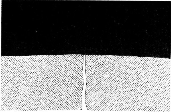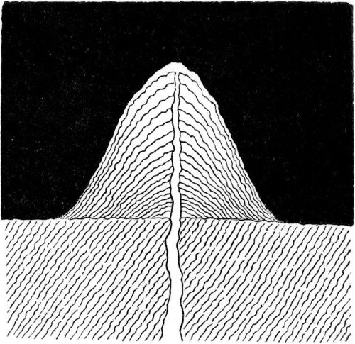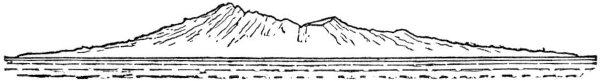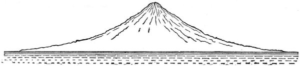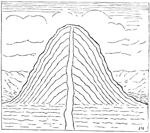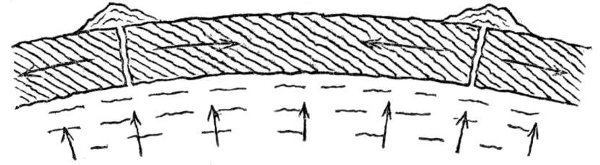 When the molten substratum had burst its confines, ejected its superfluous matter, and produced the resulting volcanic features, it would, after final solidification, resume the normal process of contraction upon cooling, and so retreat or shrink away from the external shell. Let us now consider what would be the result of this. Evidently the external shell or crust would become relatively too large to remain at all points in close contact with the subjacent matter. The consequence of too large a solid shell having to accommodate itself to a shrunken body underneath, is that the skin, so to term the outer stratum of solid matter, becomes shrivelled up into alternate ridges and depressions, or wrinkles. In its attempt to crush down and follow the contracting substratum, it would have to displace the superabundant or superfluous material of its former larger surface by thrusting it (by the action of tangential force) into undulating ridges as in Fig. 6, or broken elevated ridges as in Fig. 7, or 29 overlappings of the outer crust as in Fig. 8, or ridges capped by more or less fluid molten matter extruded from beneath, as indicated in Fig. 9, a class of action which might occur contemporaneously with the elevation of the ridge or subsequently to its formation.