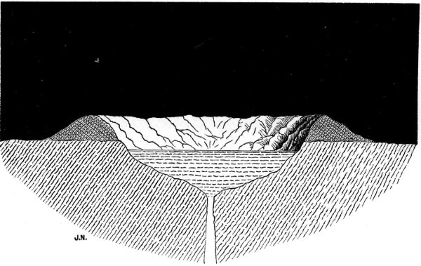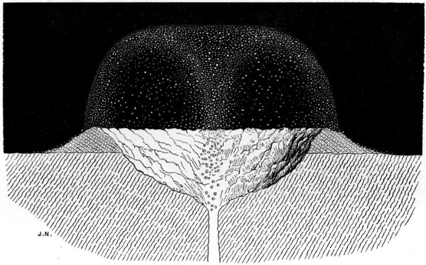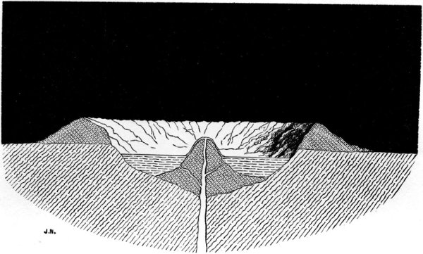Let us now consider what would be the effect produced upon a spherical mass of molten matter in progress of cooling, first under the action of the above described expansion which precedes solidification, and then by the contraction which accompanies the cooling of a solidified body. The first portion of such a mass to part with its heat being its external surface, this portion would expand, but there being no obstacle to resist the expansion there would be no other result than a temporary slight enlargement of the sphere. This external portion would on cooling form a solid shell encompassing a more or less fluid molten nucleus, but as this interior has in its turn, on approaching the point of solidification, to expand also, and there being, so to speak, no room for its expansion, by reason of its confinement within its solid casing, what would be the consequence?—the shell would be rent or burst open, and a portion of the molten interior ejected with more or less violence according to circumstances, and many of the characteristic features of volcanic action would be thus produced: the thickness of the outer shell, the size of the vent made by the expanding matter for its escape, and other conditions conspiring to modify the nature and extent of the eruption. Thus there would result vast floodings of the exterior surface of the shell by the so extruded molten matter, volcanoes, extruded mountains, and other manifestations of eruptive phenomena. The sectional diagram (Fig. 5) will help to convey a clear idea of this action. Basing our reasoning on the principle we have thus enunciated, namely, that molten telluric matter expands on nearing the point of solidification, and which we have endeavoured to illustrate by reference to actual examples of its operation, we consider we are justified in assuming that such a course of volcanic phenomena has very probably occurred again and again upon the moon; that this expansion of volume which accompanies the solidification of molten matter furnishes a key to the solution of the enigma of volcanic action; and that such theories as depend upon the agency of gases, vapour, or water are at all events untenable with regard to the moon, where no gases, vapour, or water, appear to exist.