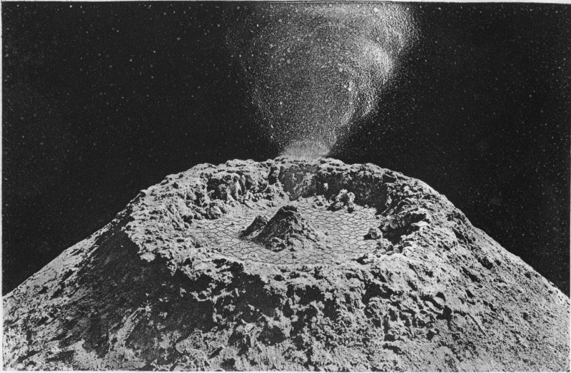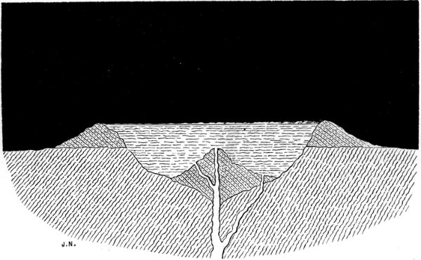 Looking again, after some hours’ interval, into the great crateral amphitheatre, we see that the rays of the morning sun have crept down the distant side of the rampart, opposite to that on which we stand, and lighted up its vast landslipped terraces into a series of seeming hill-circles with all the rude and rugged features of a terrestrial mountain view, and none of the beauties save those of desolate grandeur. The plateau of the crater is half in shadow 10,000 feet below, with its grand group of cones, now fully in sight, rising from its centre. Although these last are twenty miles away and the base of the opposite rampart fully double that distance, we have no means of judging their remoteness, for in the absence of an atmosphere there can be no aërial perspective, and distant objects appear as brilliant and distinct as those which are close to the observer. Not the brightness only, but the various colours also of the distant objects are preserved in their full intensity; for colour we may fairly assume there must be. Mineral chlorates and sublimates will give vivid tints to certain parts of the landscape surface, and there must be all the more sombre colours which are common to mineral matters that have been subjected to fiery influence. All these tints will shine and glow with their greater or less intrinsic lustres, since they have not 166 been deteriorated by atmospheric agencies, and far and near they will appear clear alike, since there is no aërial medium to veil them or tarnish their pristine brightness.