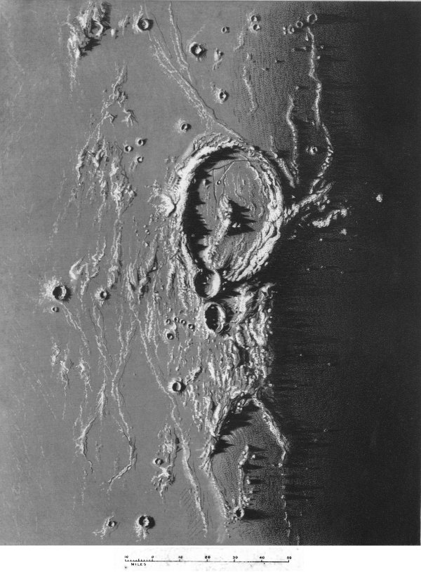 Arrived at this stage of our subject we thought it needful to introduce some pages of data and descriptive detail. Accordingly in one chapter we discussed the form, magnitude, weight, and density of the moon, and the force of gravity at its surface: and the more soundly to fix these data in the mind, we devoted a few lines to explanation of the methods whereby each has been ascertained. We then examined the question (so important to our subject) of the existence or non-existence of a lunar atmosphere, giving the evidence, which may be regarded as conclusive, in proof of the absence of both air and water from the moon, and, therefore, refuting the claim of these elements to be considered as sources or influants of the moon’s volcanic manifestations. A general coup-d’œil of the lunar hemisphere facing the earth next engaged our attention, and we considered the aspect of the disc as it is viewed by the naked eye and with telescopes of various powers. From this general 186 survey we passed to the topography of the moon, tracing briefly the admirable labours of those who have advanced this subject, and, by aid of picture and skeleton maps and a table of position co-ordinates, placing it within the reader’s power to become more than sufficiently acquainted for the purposes of this work with the names and positions of detail objects and features of interest. Special descriptions of interesting and typical spots and regions were given in some few cases where such appeared to be called for.