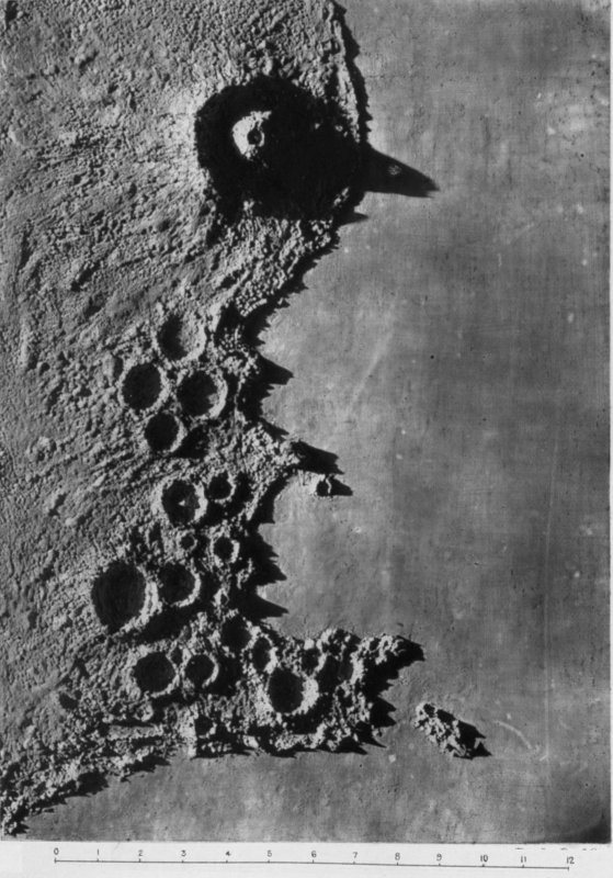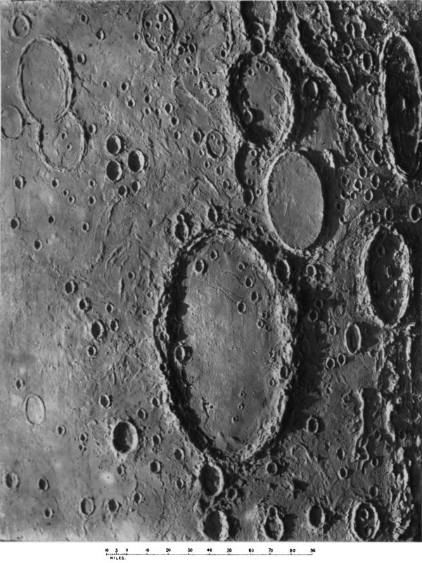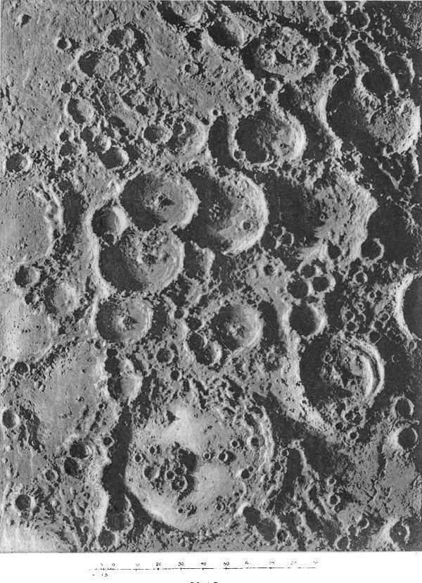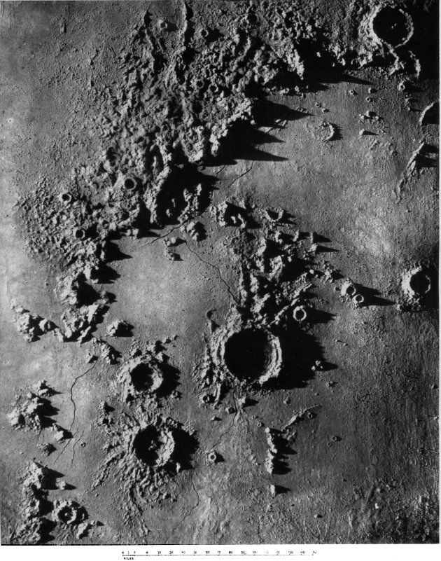 From craters manifestly volcanic we passed to the consideration of those circular formations which, from their vastness of size, scarcely admit of satisfactory explanation by a volcanic hypothesis. We summarized several proffered theories of their origin, and pointed out what we considered might be a possible key to the solution of the selenological enigma which they constitute, without, however, expressing ourselves entirely 187 satisfied with the validity of our suggestion. The less mysterious features presented by peaks and mountain ranges were then discussed to the extent that we considered requisite, viewing their comparatively simple character and the secondary position they occupy in point of numerical importance upon the moon. At greater length we dealt with the cracks and chasms and the allied phenomena of radiating streaks, pointing out with regard to these latter the strikingly beautiful correspondence in effect (and therefore presumably in cause) between them and crack-systems of a glass globe “starred” by an expanding internal medium.