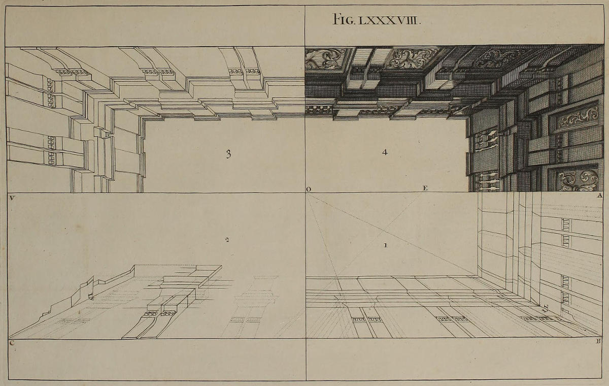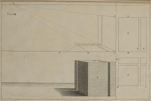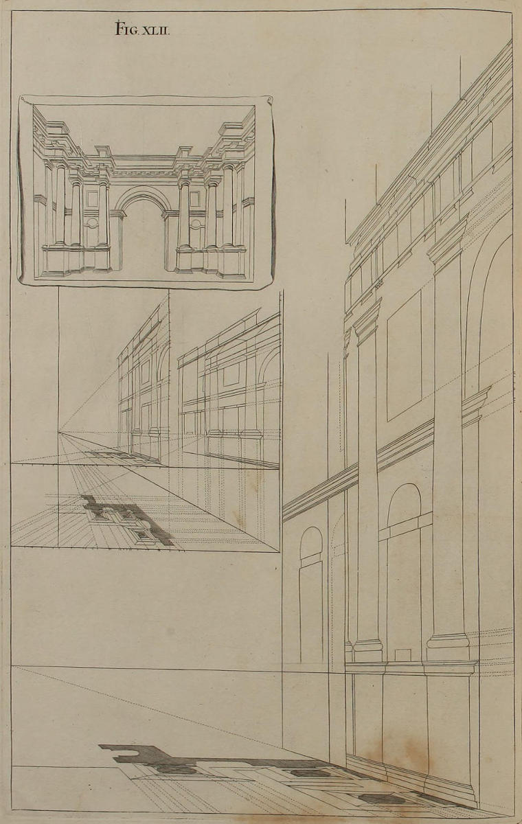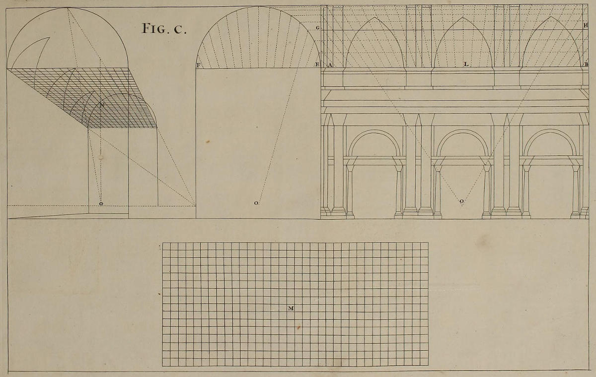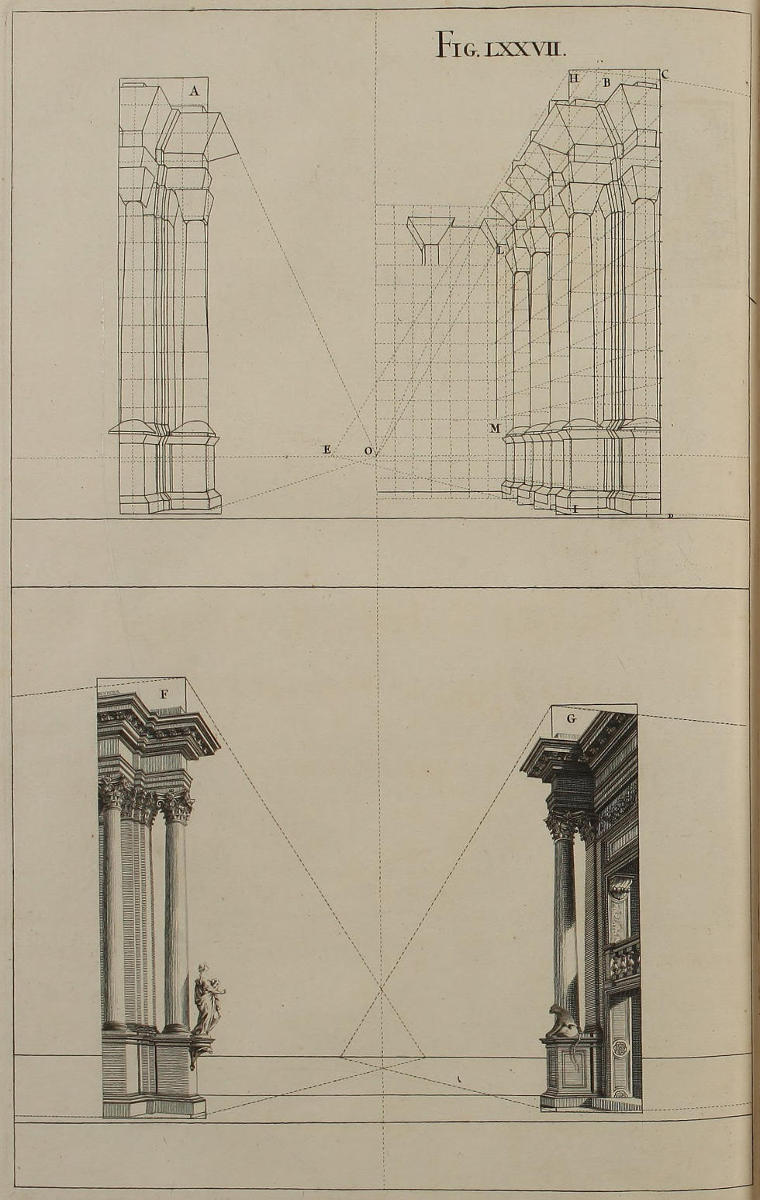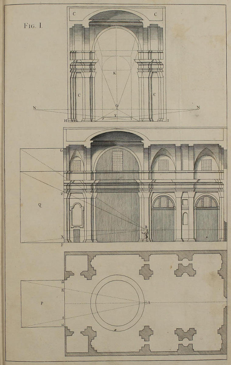 Concinnitatem ac symmetriam opticæ delineationes ædificiorum habere nequeunt, nisi utramque mutuentur ab Architectura. Proinde necesse est, ut in istius graphide ac intelligentia te aliquandiu exerceas, donec uniuscujusque elevationis vestigium formare didiceris, ex eoque eruere sectionem totius longitudinis, ut in Opere toto videre est, præsertim figuris sexagesimaoctava & septuagesima. Siquidem ex vestigio & ex sectione derivatur in opticas imagines congrua rerum singularum profunditas.