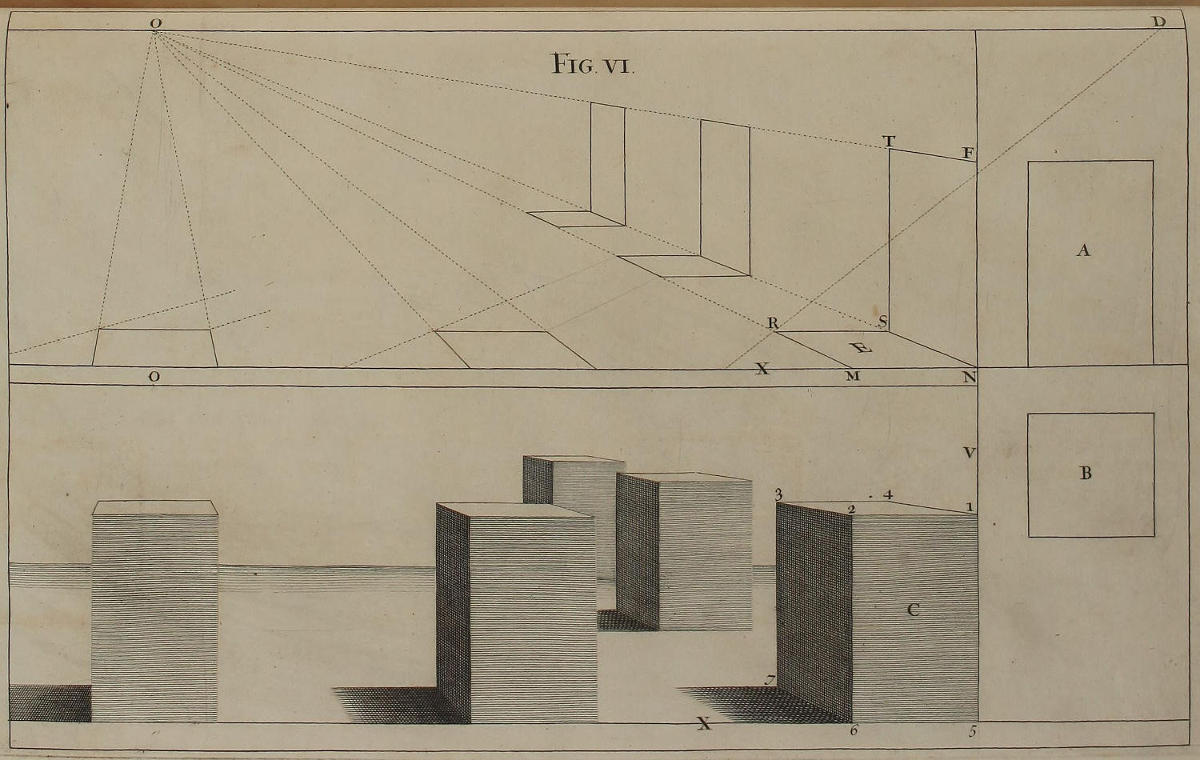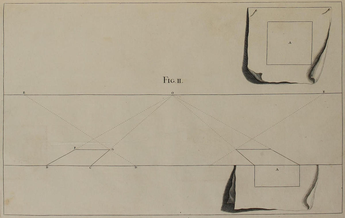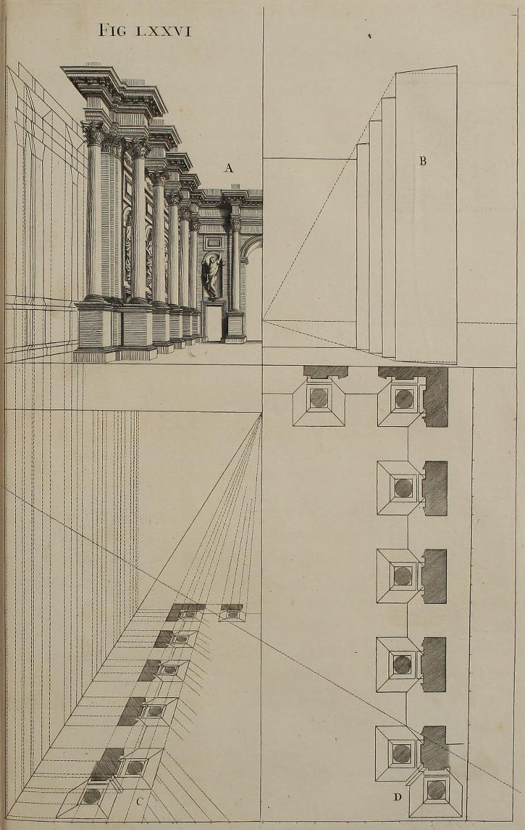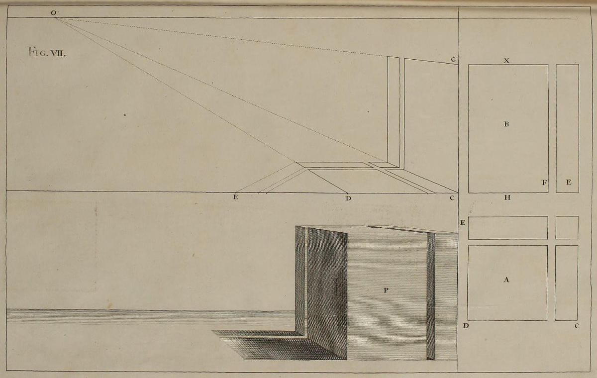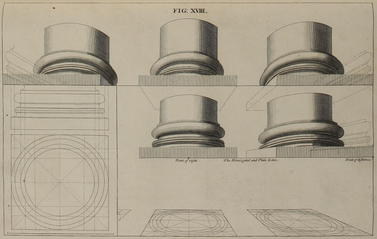 ’Tis something unaccountable, that, among so many learned Persons as have handled this Subject, Priests, Architects, and Painters; very few, if any of them, have given Directions proper for shunning that Disorder and Confusion of Lines, which, in most Instances, must necessarily attend the Execution of their Rules: In all or most of which, the whole Space for the Performance is confin’d between the Lines of the Plan and Horizon; which, where the Scale is small, and the Height of the Eye not very much advanc’d, renders the Work exceedingly confus’d; and where those Lines are coincident, (which frequently happens) the Method becomes utterly impracticable.