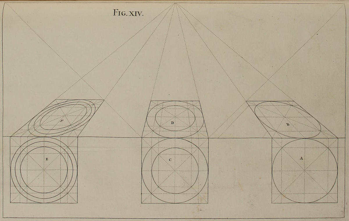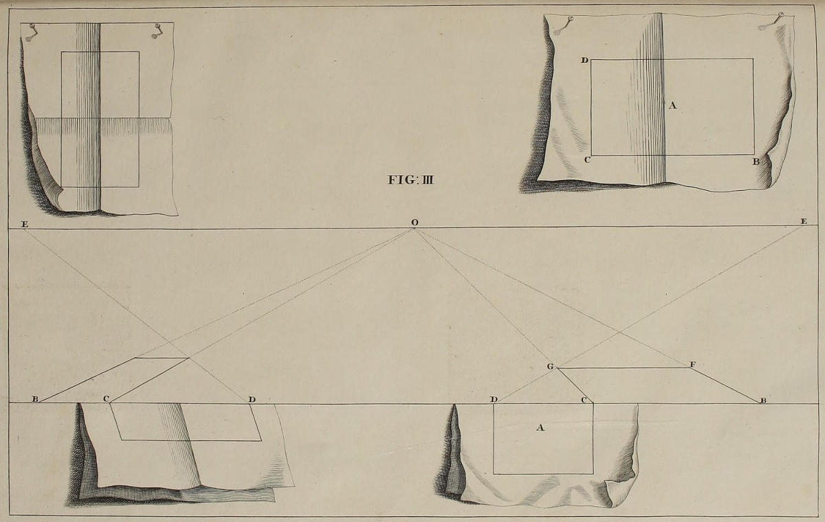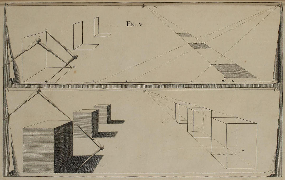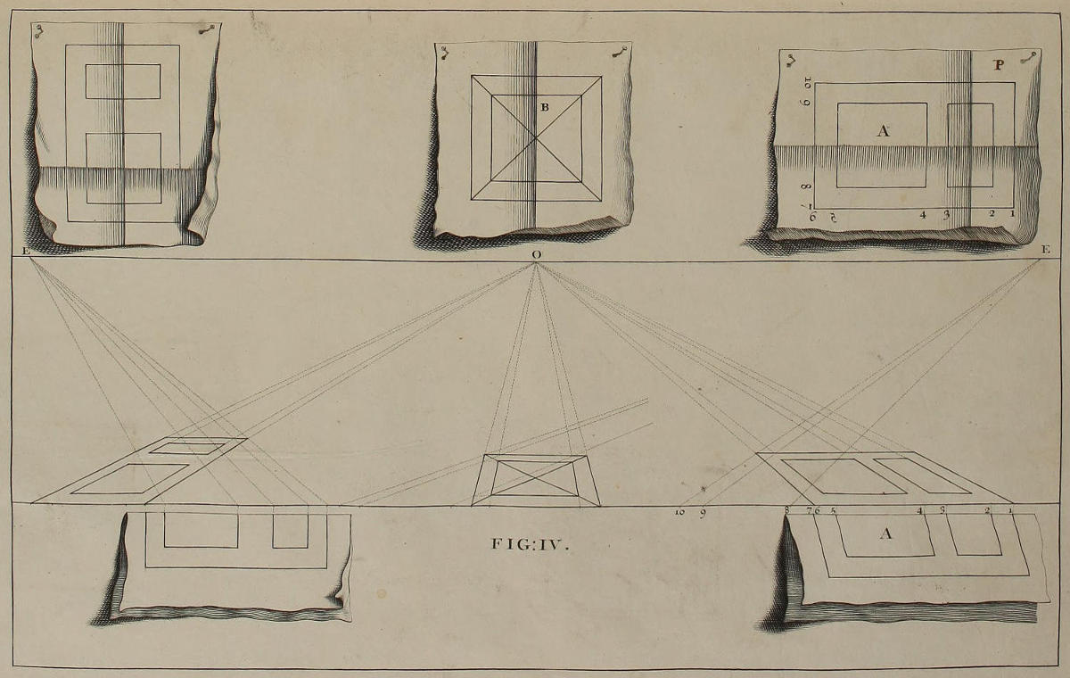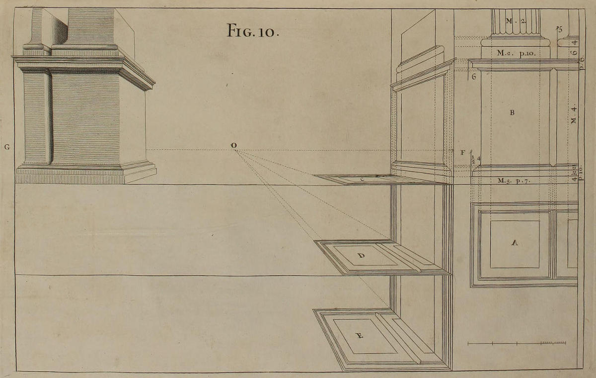’Tis something unaccountable, that, among so many learned Persons as have handled this Subject, Priests, Architects, and Painters; very few, if any of them, have given Directions proper for shunning that Disorder and Confusion of Lines, which, in most Instances, must necessarily attend the Execution of their Rules: In all or most of which, the whole Space for the Performance is confin’d between the Lines of the Plan and Horizon; which, where the Scale is small, and the Height of the Eye not very much advanc’d, renders the Work exceedingly confus’d; and where those Lines are coincident, (which frequently happens) the Method becomes utterly impracticable.