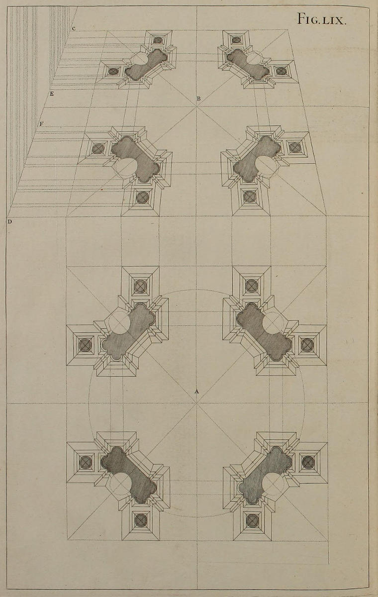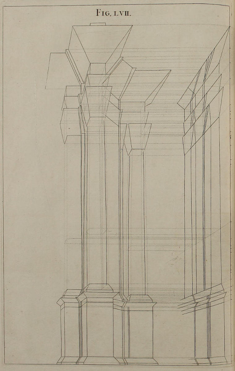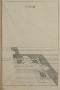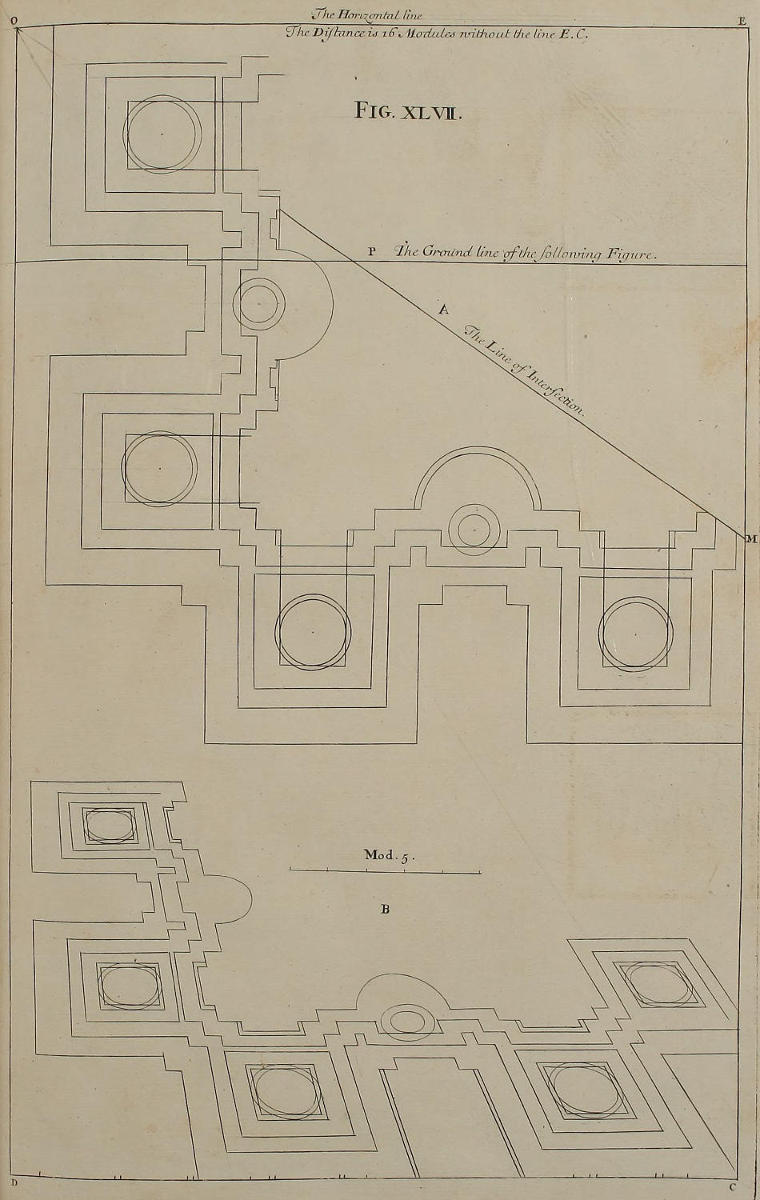III. That from the Disposition of the Perspective-Plans and Uprights, with respect to the finish’d Pieces in the Twelfth and many following Figures, you would observe, with what Dispatch the said Pieces may, without the Help of Compasses, be delineated by your Drawing-Square; viz. the Perpendiculars from the Perspective-Plan, and the level Lines from the Perspective-Upright, or Section.