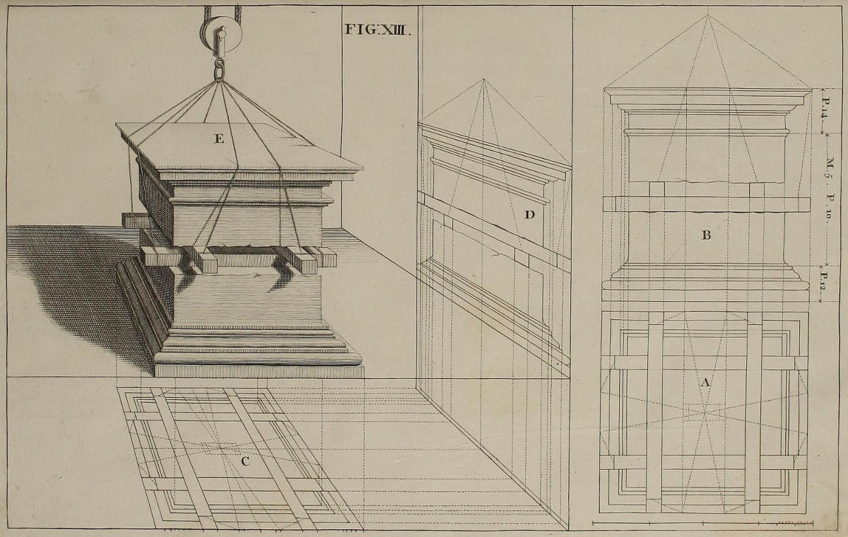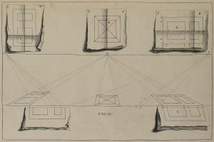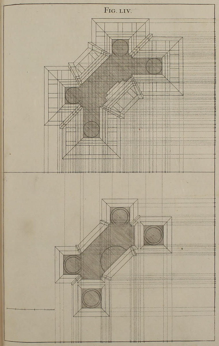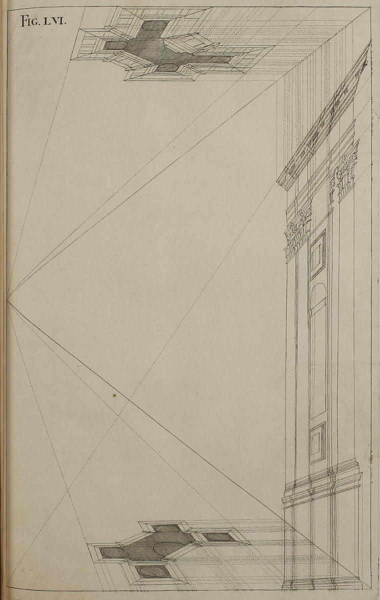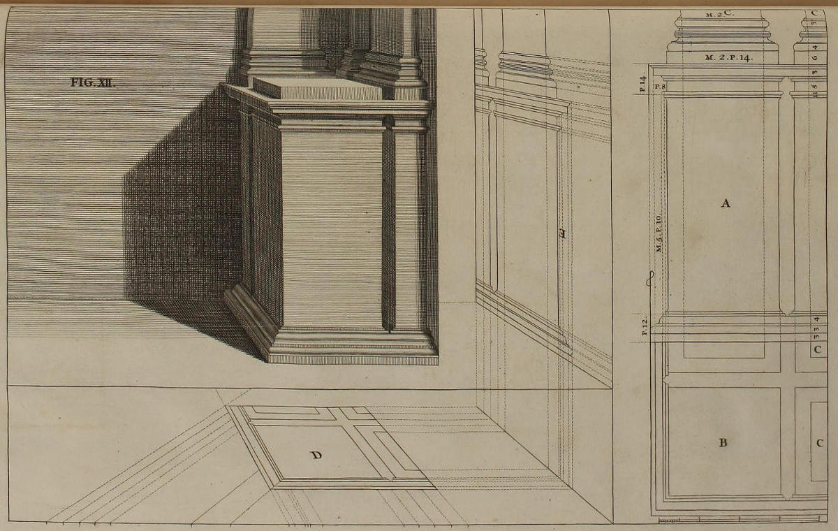 III. That from the Disposition of the Perspective-Plans and Uprights, with respect to the finish’d Pieces in the Twelfth and many following Figures, you would observe, with what Dispatch the said Pieces may, without the Help of Compasses, be delineated by your Drawing-Square; viz. the Perpendiculars from the Perspective-Plan, and the level Lines from the Perspective-Upright, or Section.