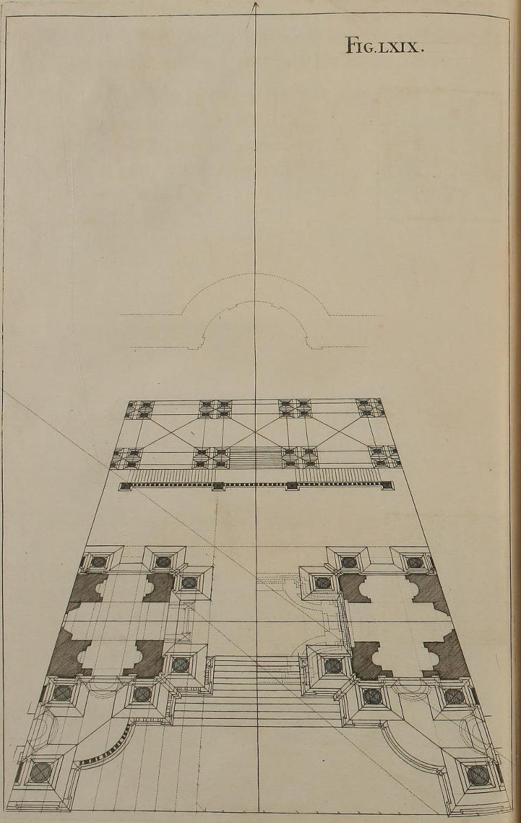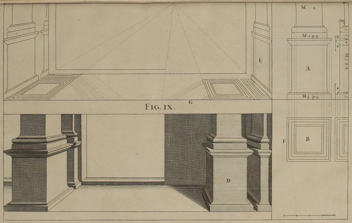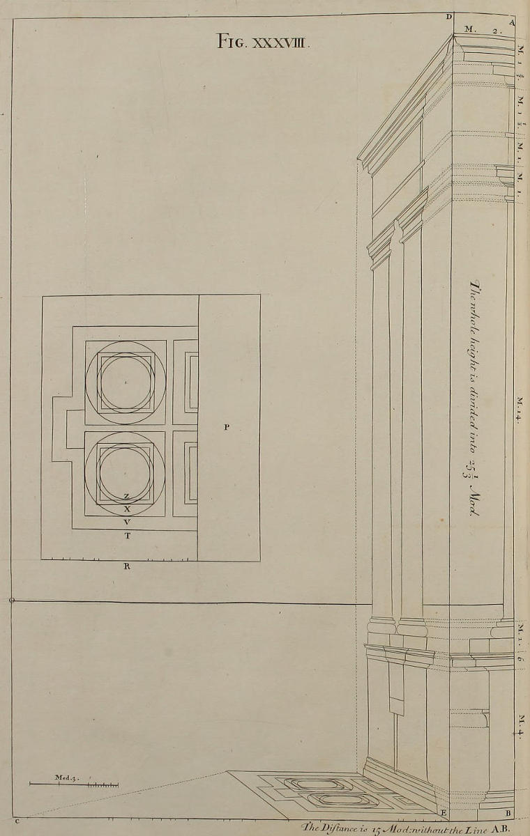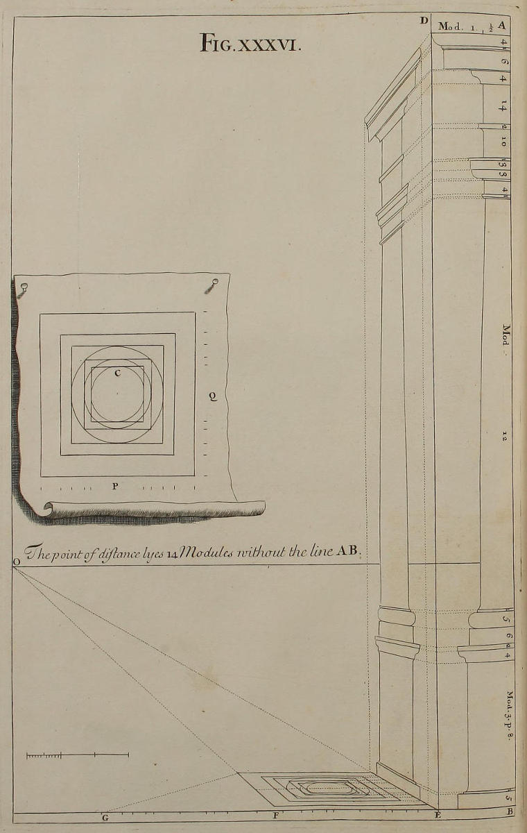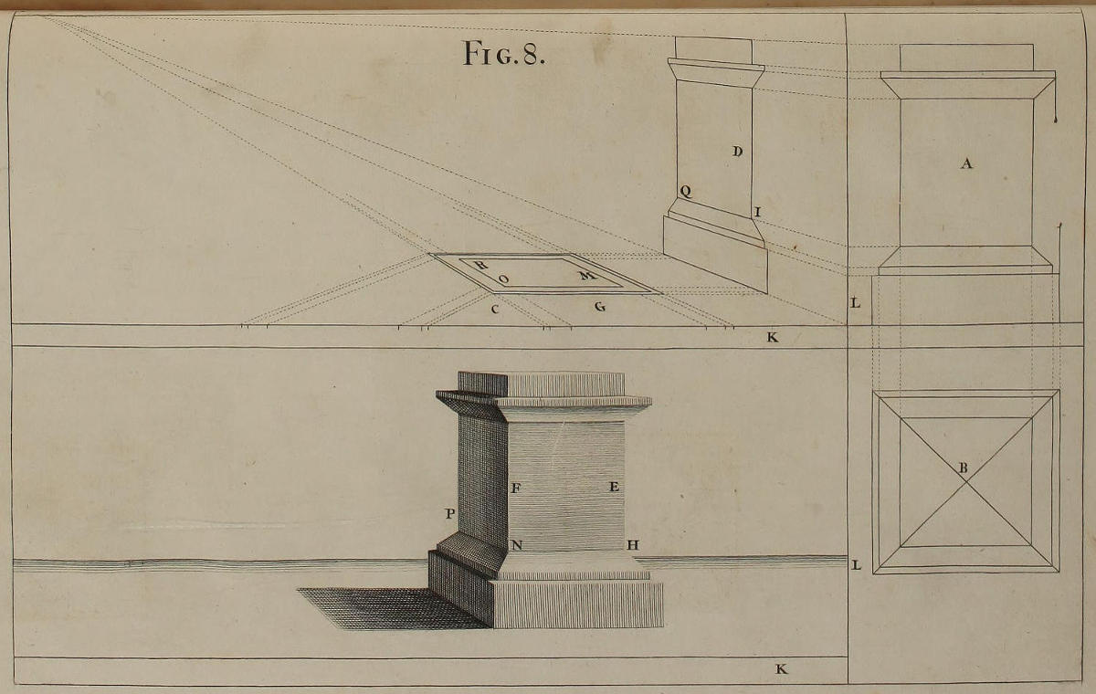 The Perspective of Structures here treated of, can have no Grace or Proportion, without the Help of Architecture. ’Tis therefore absolutely necessary, that you employ yourself for some time in Drawing, and the Study of that Art; till you can readily describe the Plan of any Upright, and from thence project the Section or Profile, as is shewn through the whole Course of this Work; and more particularly, in the Sixty-eighth and Seventieth Figures: Forasmuch as the proper Depth of each Part of the Perspective, is determin’d by the Plan and Profile thereof.