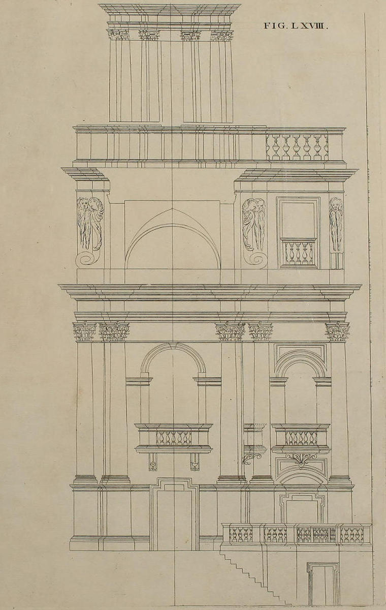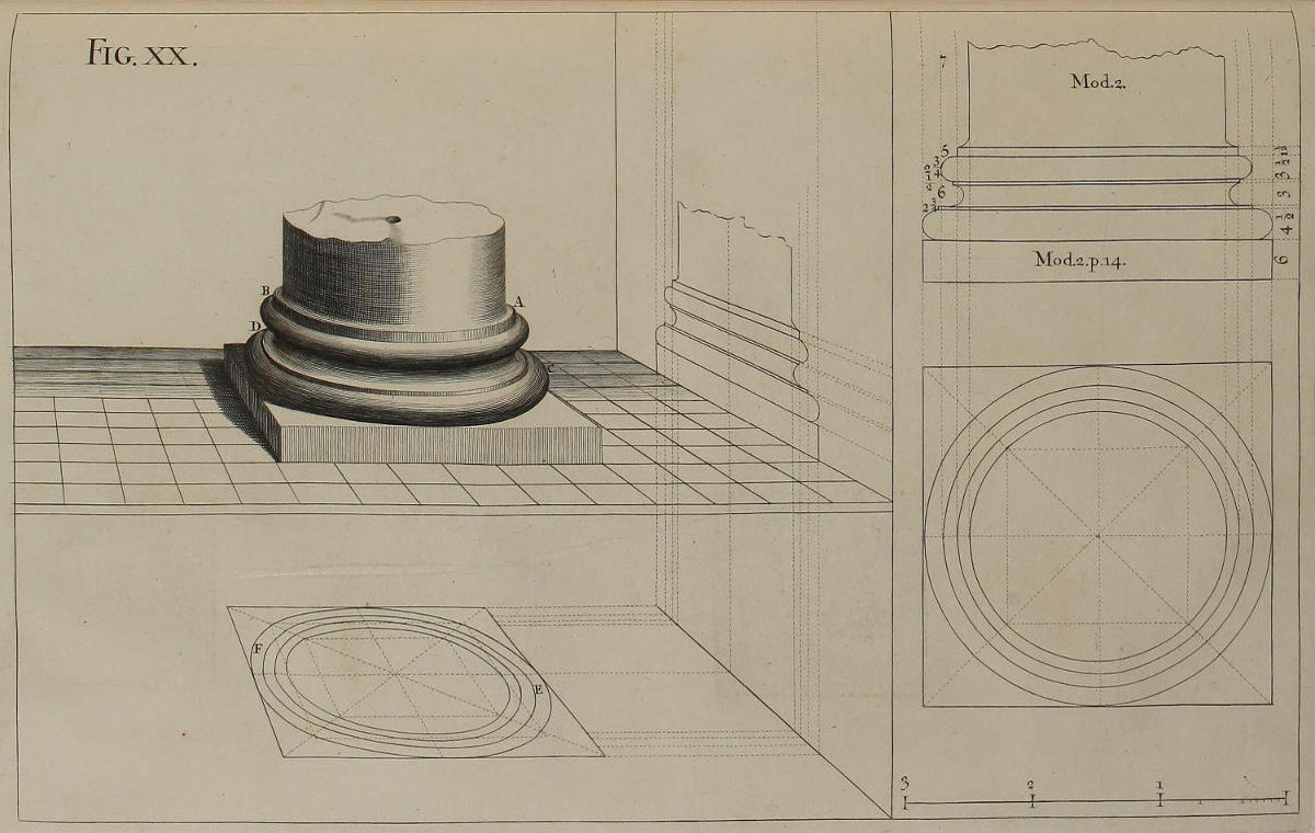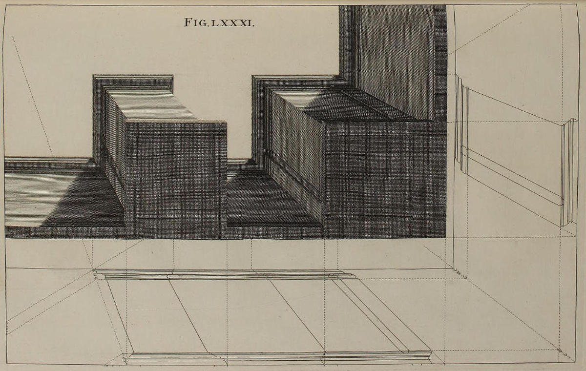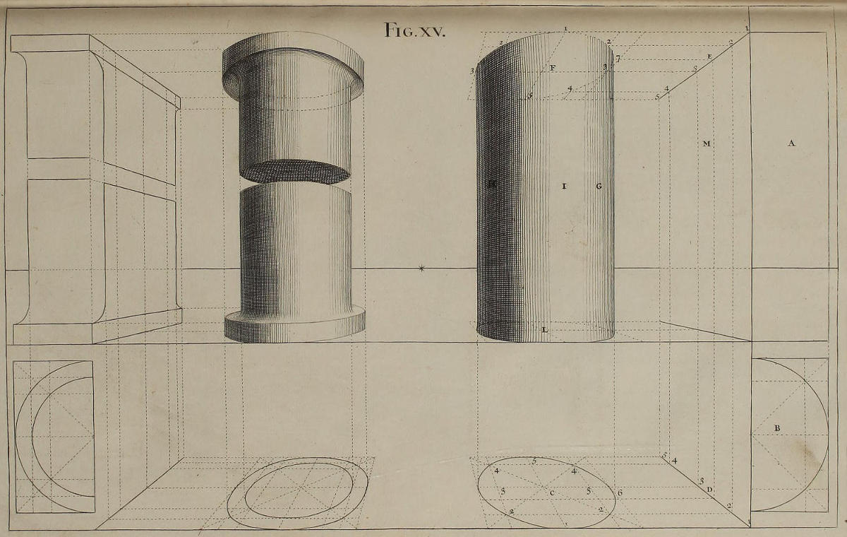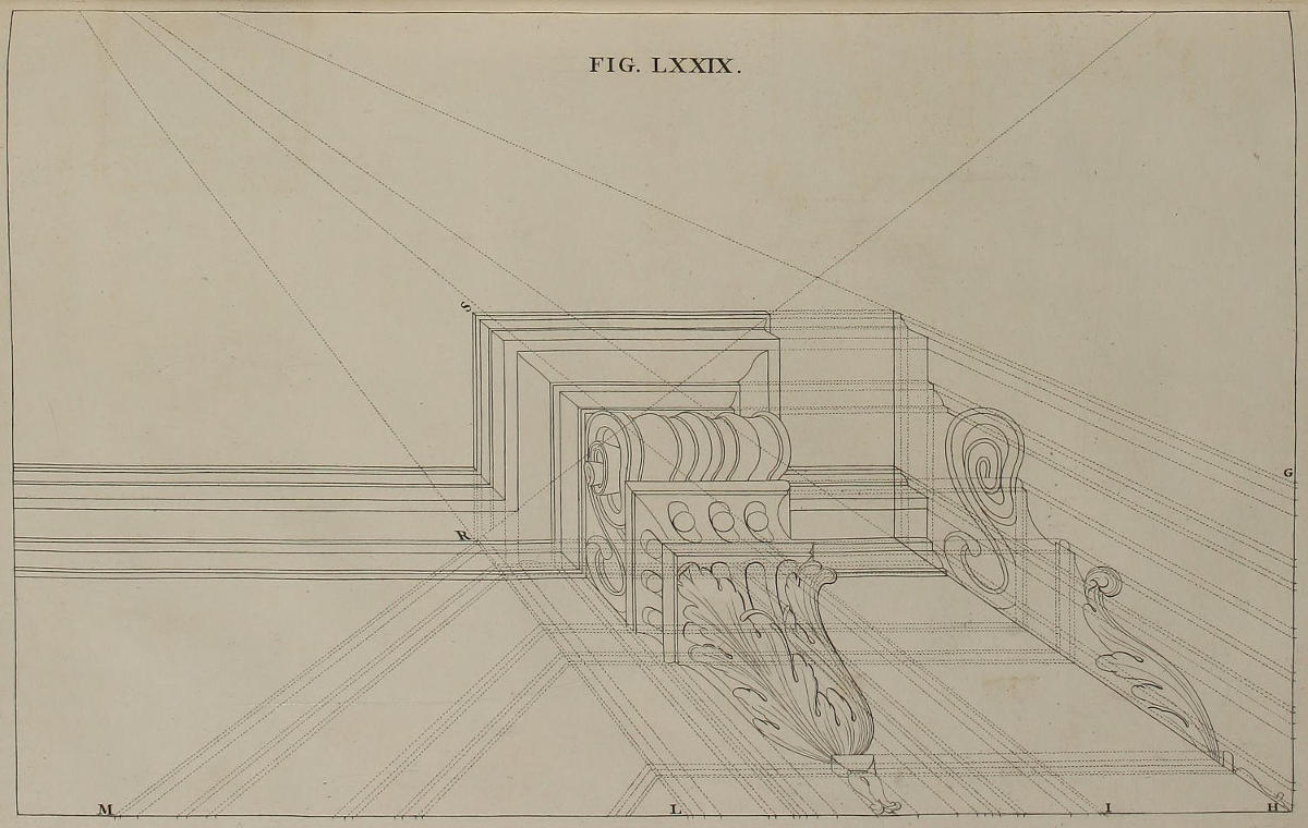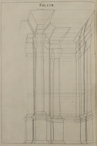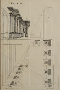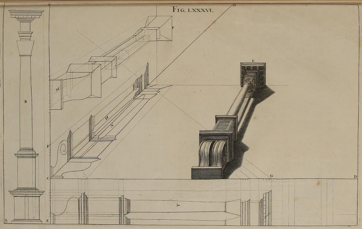 The Perspective of Structures here treated of, can have no Grace or Proportion, without the Help of Architecture. ’Tis therefore absolutely necessary, that you employ yourself for some time in Drawing, and the Study of that Art; till you can readily describe the Plan of any Upright, and from thence project the Section or Profile, as is shewn through the whole Course of this Work; and more particularly, in the Sixty-eighth and Seventieth Figures: Forasmuch as the proper Depth of each Part of the Perspective, is determin’d by the Plan and Profile thereof.