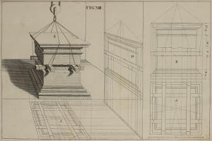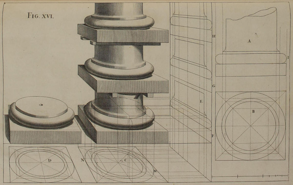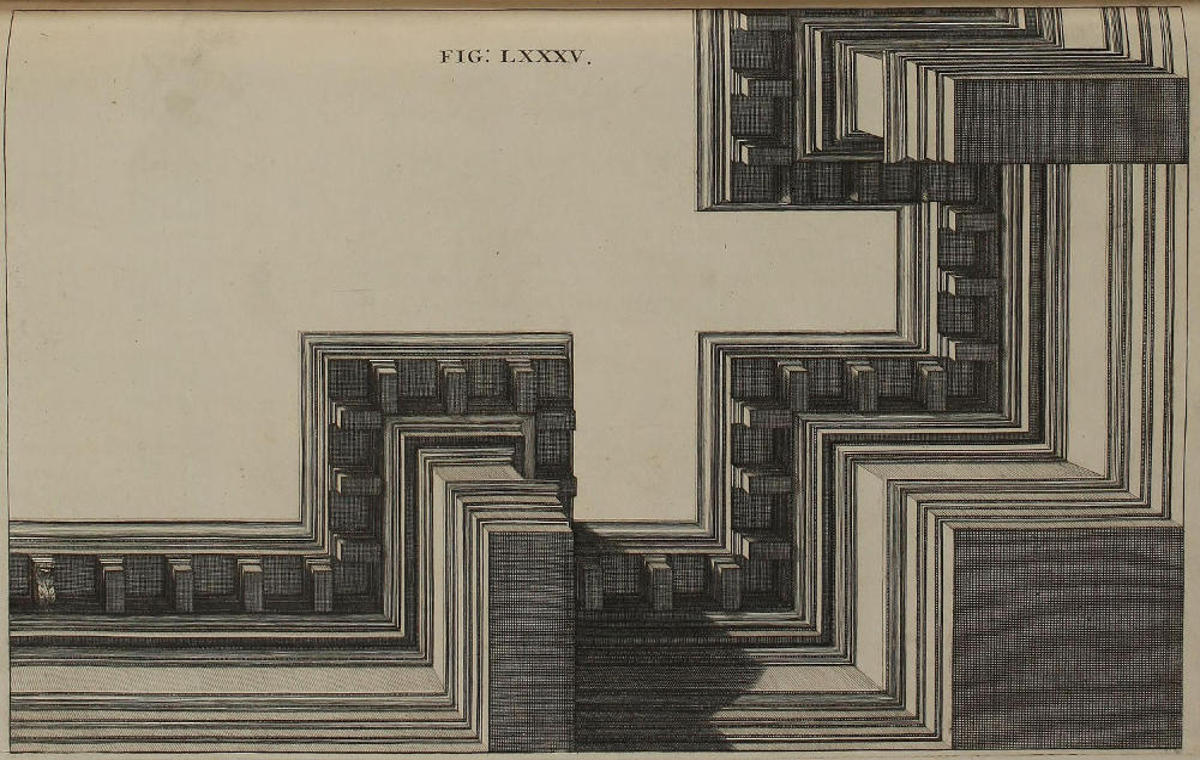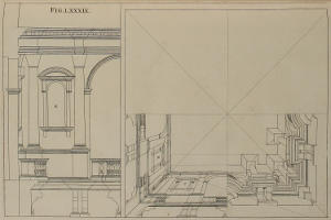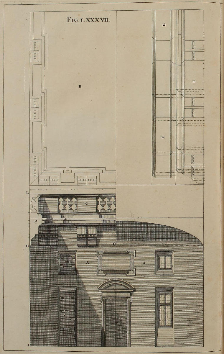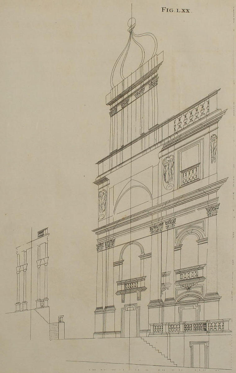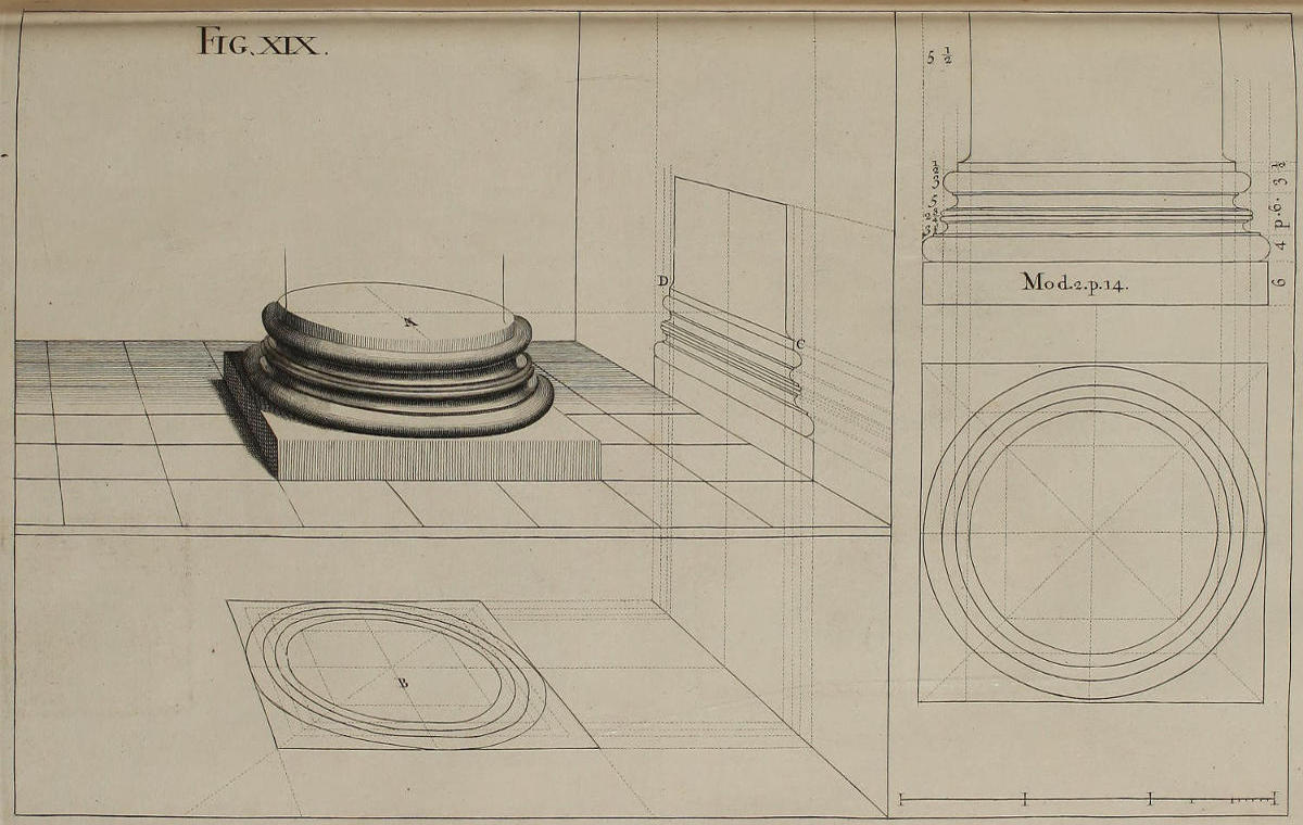 The Perspective of Structures here treated of, can have no Grace or Proportion, without the Help of Architecture. ’Tis therefore absolutely necessary, that you employ yourself for some time in Drawing, and the Study of that Art; till you can readily describe the Plan of any Upright, and from thence project the Section or Profile, as is shewn through the whole Course of this Work; and more particularly, in the Sixty-eighth and Seventieth Figures: Forasmuch as the proper Depth of each Part of the Perspective, is determin’d by the Plan and Profile thereof.