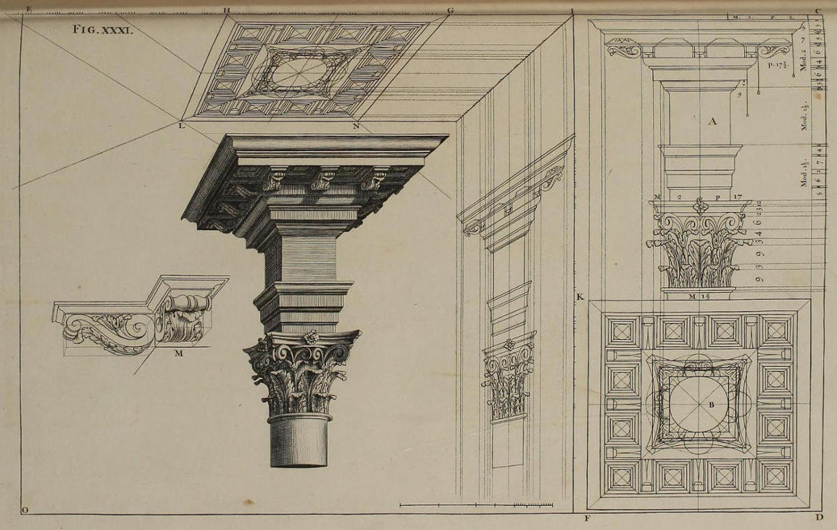 | Optica projectio coronicis Corinthiæ, cum capitello & summitate columnæ, | XXXI. | The Optick Projection of a Corinthian Cornice, with the Capital and part of the Column. |