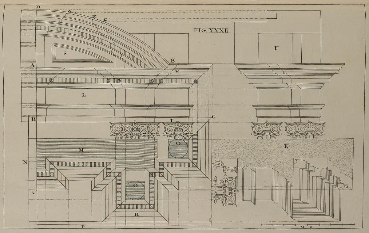 | Delineatio geometrica coronicis Ordinis Compositi, | XXXII. | The Geometrical Design of a Cornice of the Composite Order. |