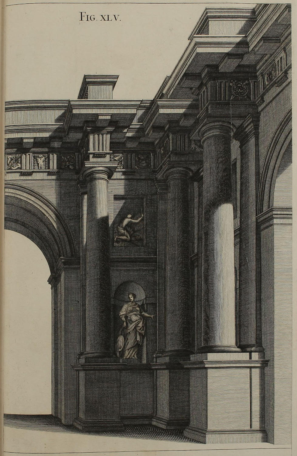 | Dimidium ædificii Dorici opticè deformati, | XLV. | One half of the Dorick Design in Perspective. |