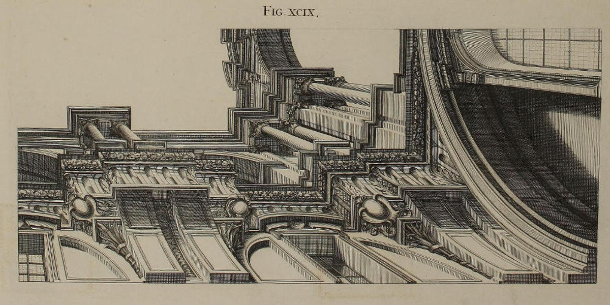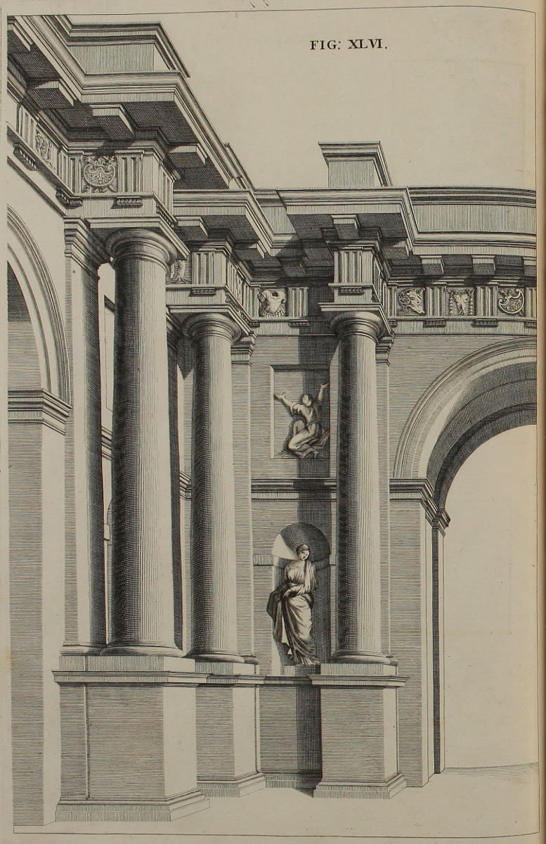 This Author’s great Experience in the Practice of Perspective, having furnish’d him with excellent RULES for Shortning the Work, and Obviating the foremention’d Difficulties; he has here very generously imparted them, and especially the latter, in the Tenth and Eleventh Figures. And tho’ on Perusal of the first three or four Plates, this Method may possibly seem the same that some others have before made use of; yet whoever shall diligently observe and copy the Rules and Examples of the succeeding Figures, must necessarily acknowledge the great Advantage this has in a Perspective-Plan and Upright, clear and distinct; whence the finish’d Piece is deduc’d, without the least Incumbrance of the Work. The Explanations of the Rules here given, are short and instructive; and the Architectonical Designs produc’d to exemplify them, Noble and Magnificent.