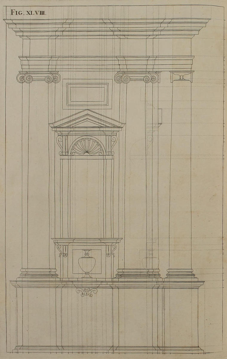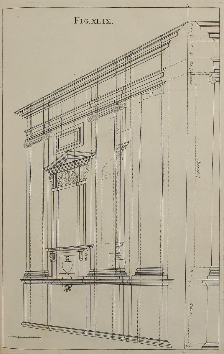 | Elevatio geometrica ædificii Ionici, | XLVIII. | Geometrical Upright of the foregoing Ionick Design. |