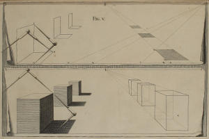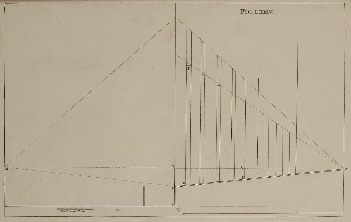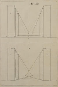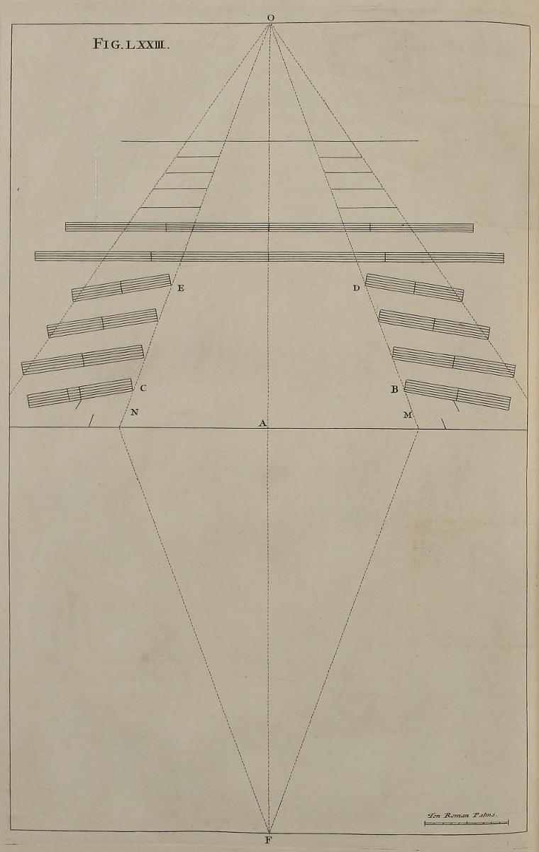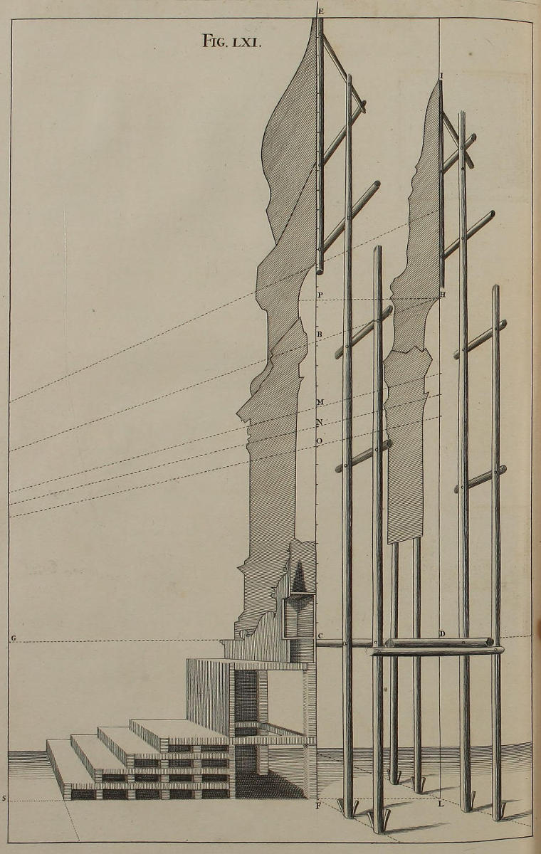 The Manner of Designing, where the Perspective is drawn on several Ranges of Frames one behind the other, and such Scenes of Theaters whose Grooves lie oblique to the middle Line, is also here laid down: And by our Author’s Method, Horizontal Perspective, or that of Ceilings, is render’d less difficult than the Vertical, or that against an upright Wall. Upon the whole, nothing seems wanting that may make a Work of this nature complete; unless what concerns Designs which are either Circular, or abound with many Columns: For the Performance whereof, the Author, as he promises in the Sixty-fifth Figure, has, in a SECOND Volume, given a Rule more proper for the purpose; which also may possibly be made English in due time, if this Part meet with Encouragement.