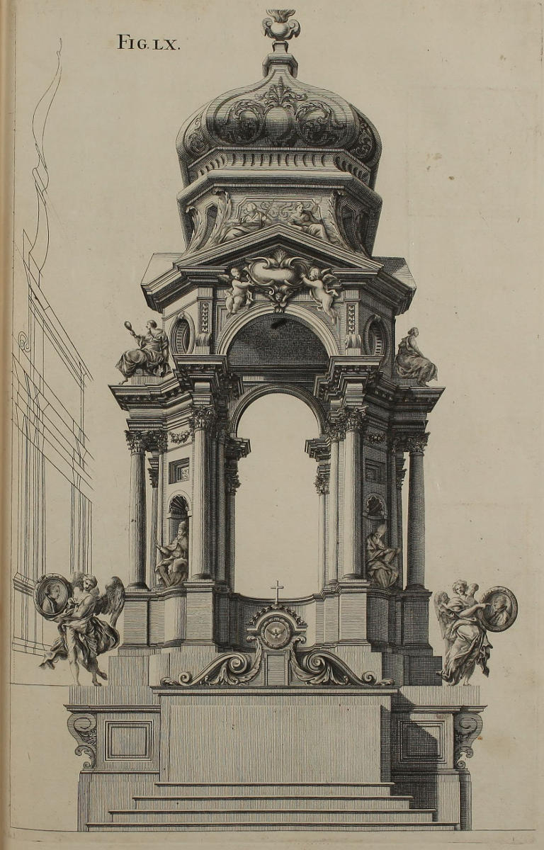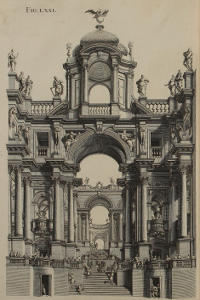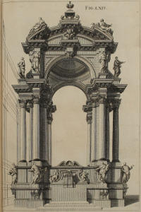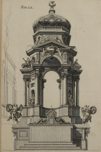 | Theatrum repræsentans nuptias Canæ Galilææ, constructum Romæ anno 1685, in expositione Ven. Sacramenti, in templo Farnesiano Societatis Jesu, | LXXI. | A Theater representing the Marriage of Cana in Galilee, erected in the Jesuits Church at Rome, 1685, for the Solemnity of exposing the Holy Sacrament. |
