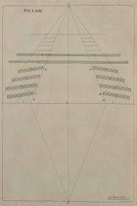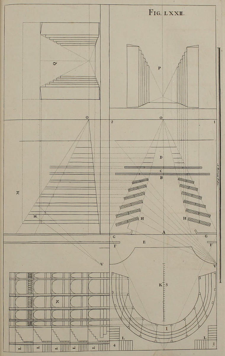 | Aliud vestigium theatri; ubi de modo inveniendi ejus punctum, | LXXIII. | Another Plan of a Theater, with the Method of finding the Point of Sight therein. |