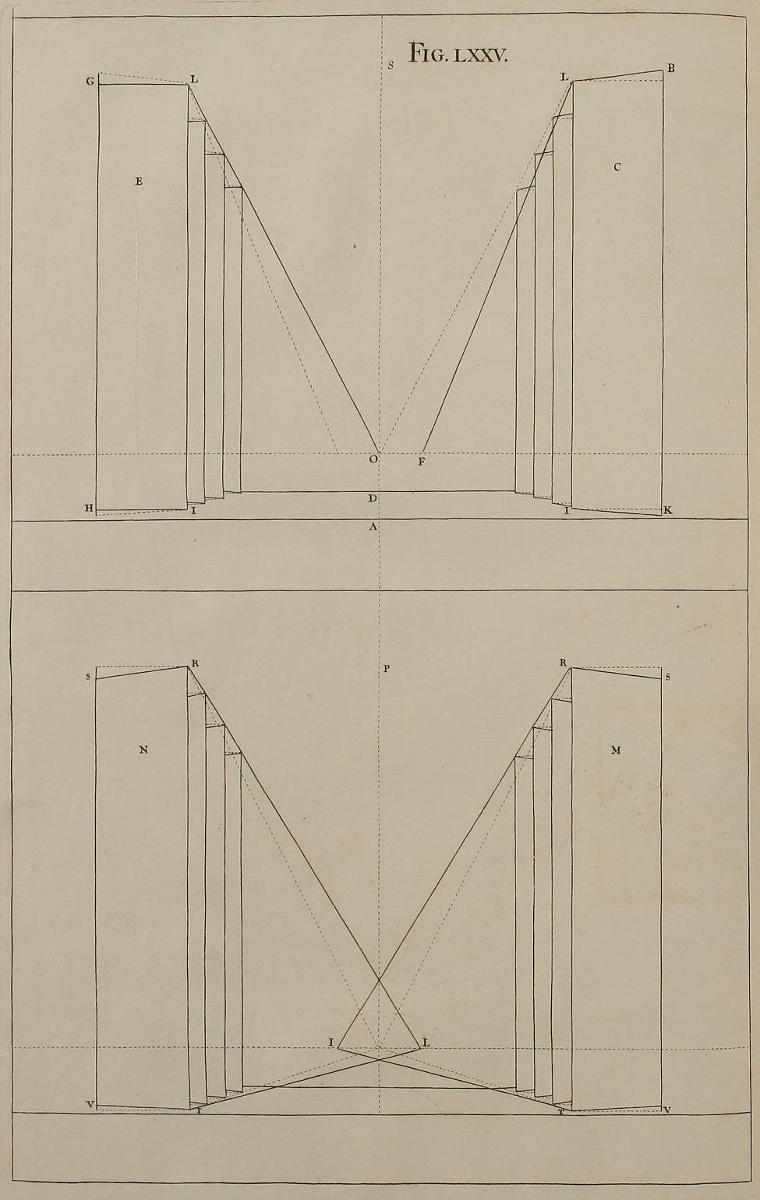 | Elevatio scenarum coram inspectarum; ubi docetur artificium, ut scenæ obliquæ appareant rectæ, | LXXV. | The Elevation of Scenes in Front, and how the oblique Scenes are made to appear direct. |