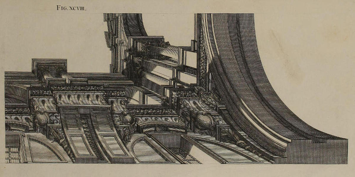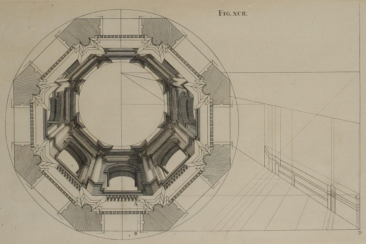 | Quadrans Architecturæ horizontalis in fornice, cum luminibus & umbris, | XCVIII. | Fourth-part of the Architectonical Design on the Vault of S. Ignatius’s Church, with its Lights and Shades. |