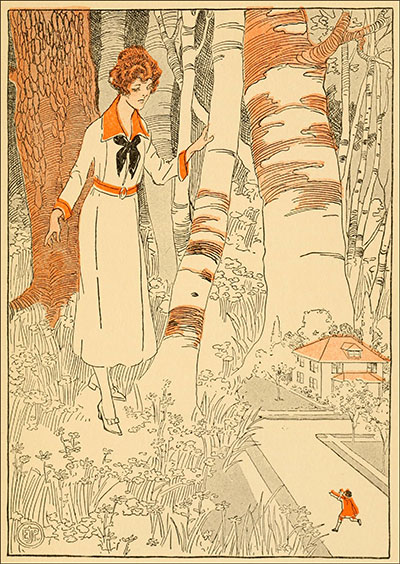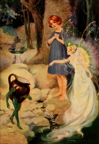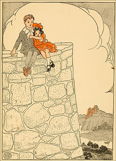 On a summer afternoon Mary Frances took a holiday and sailed away across the blue water to an island—an island formed by the top of a coral mountain resting in a sea of blue; oh, so blue—a brighter blue than the water in your mother’s bluing tub—not the blue that makes you feel sad and blue, but the blue that makes you laugh with happiness. The island itself and the roofs of the houses were coral white, and the green was the green of the palm and banana and mahogany tree. The breezes that blew over them were the warm, soft breezes of the southern sun. This island was the “enchanted island” of the good story-tellers which Mary Frances was allowed to visit. The story people who lived there believed in truth and beauty, and courage and kindness, and these were the theme of their stories. Like all good islands, this island had enemies, but they came to a bad end, as, in the long run, all evil persons will; and truth and beauty, and courage and kindness won the day, as they always must in every land where the searchlight of the sun flashes its beams.
