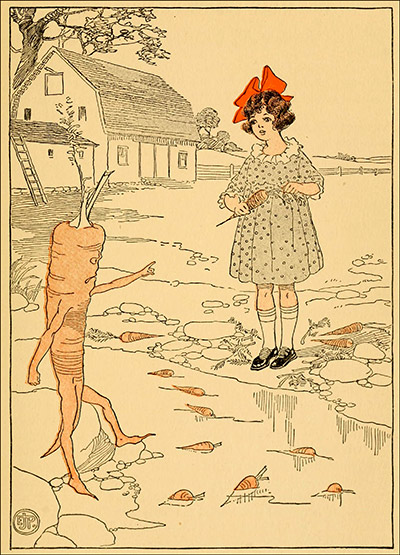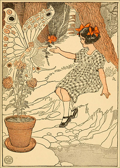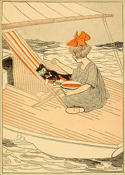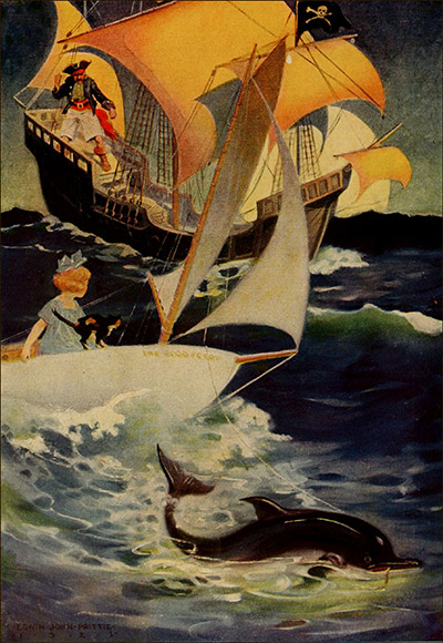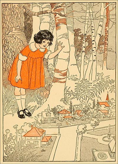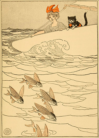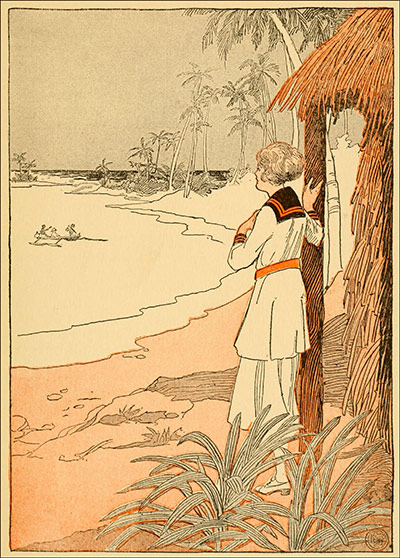 On a summer afternoon Mary Frances took a holiday and sailed away across the blue water to an island—an island formed by the top of a coral mountain resting in a sea of blue; oh, so blue—a brighter blue than the water in your mother’s bluing tub—not the blue that makes you feel sad and blue, but the blue that makes you laugh with happiness. The island itself and the roofs of the houses were coral white, and the green was the green of the palm and banana and mahogany tree. The breezes that blew over them were the warm, soft breezes of the southern sun. This island was the “enchanted island” of the good story-tellers which Mary Frances was allowed to visit. The story people who lived there believed in truth and beauty, and courage and kindness, and these were the theme of their stories. Like all good islands, this island had enemies, but they came to a bad end, as, in the long run, all evil persons will; and truth and beauty, and courage and kindness won the day, as they always must in every land where the searchlight of the sun flashes its beams.