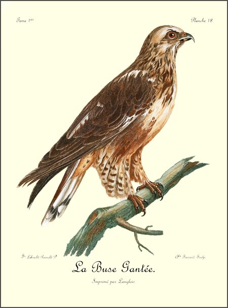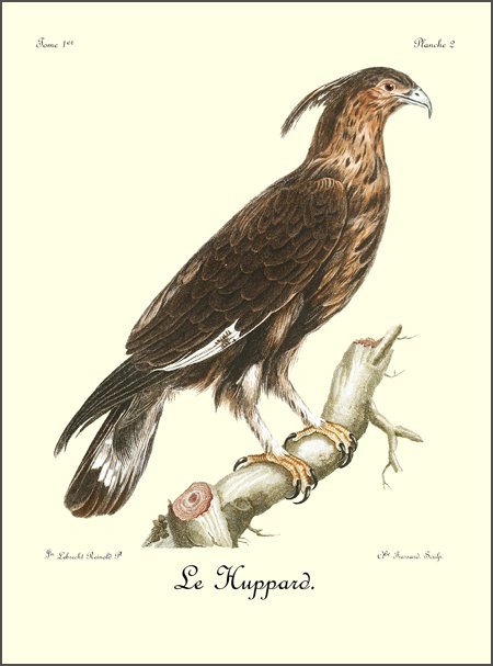 Comme le griffard, le petit aigle, dont il est ici question, est caractérisé par une huppe, mais qui est beaucoup plus allongée; ses pieds sont de même couverts d’un fin duvet, qui s’étend jusqu’à la naissance des doigts; son bec crochu, ses ongles fortement arqués et bien affilés, annoncent un oiseau de guerre et de destruction, quoique sa taille ne surpasse guère celle de nos plus fortes buses. N’ayant pas assez de force pour saisir et abattre les gazelles, le Huppard se contente du menu gibier, tels que lièvres, canards et perdrix, qu’il chasse avec dextérité. Ses longues aîles, dont la pointe s’étend presqu’aussi loin que le bout 9 de la queue, lui servent merveilleusement bien pour s’élancer avec promptitude et saisir avec succès des oiseaux dont le vol est aussi rapide que celui des perdrix d’Afrique.