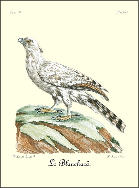 Le Blanchard a le corps moins gros que nos aigles; il est plus allongé et plus svelte de taille; enfin, comme il convenoit qu’il fut construit pour la chasse aux oiseaux. Il est, en un mot, à nos aigles ce que sont les lévriers aux dogues.