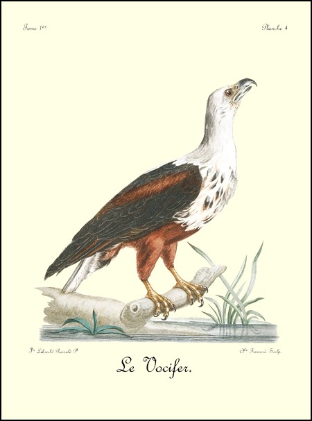 Le Vocifer, de même que l’orfraie et le balbusard, fond rapidement du haut des airs sur le poisson qu’il apperçoit. J’ai eu souvent occasion de voir cet aigle s’abattre avec bruit sur l’eau, y plonger même entièrement son corps, et en sortir tenant un gros poisson dans ses serres. C’est sur des rochers voisins ou sur des troncs d’arbres que les eaux ont déracinés, chariés et amoncelés sur les bords des rivières, qu’il va dévorer sa proie et qu’il fait l’établissement de sa pêcherie d’une manière fixe et stable; car il mange habituellement sa pêche aux mêmes endroits, qu’il est facile de reconnoître aux monceaux de têtes et d’arêtes de poisson que l’on y trouve. J’ai vu des ossemens de gazelles parmi ces restes; ce qui prouve qu’il chasse aussi ce gibier. Il dédaigne apparemment de faire la guerre aux oiseaux; car je n’en ai jamais trouvé des débris dans ceux dont j’ai parlé, mais bien ceux d’une espèce de grand lézard très-commun dans plusieurs rivières d’Afrique.