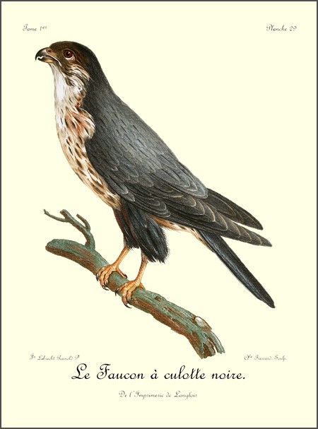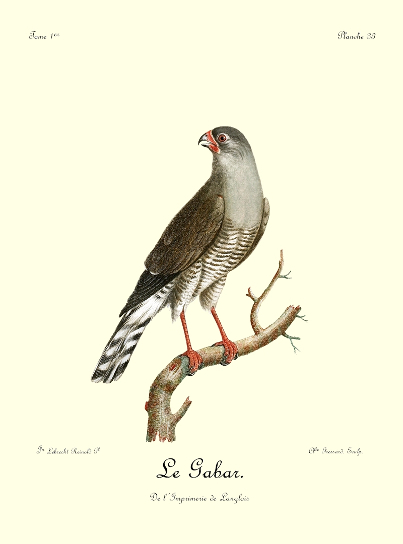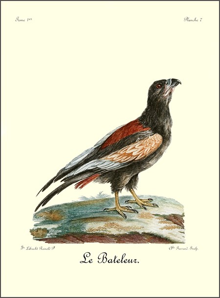 Le canton où j’ai vu le plus communément le Bateleur est celui où j’étois campé sur les bords du Queur-Boom, proche la baie Lagoa. Ils ne volent point en troupe, et on n’en voit plusieurs ensemble que lorsqu’un concours d’autres oiseaux de proie a attiré tous ceux du canton sur quelques cadavres. Dans ce seul cas, on les trouve rassemblés; mais quand ils sont 35 repus, chaque couple prend une route différente pour se rendre dans leurs retraites respectives, et s’enfoncer dans les montagnes voisines ou dans les différens quartiers de la forêt, où ils ont établi leur demeure.