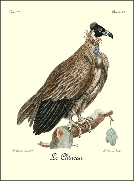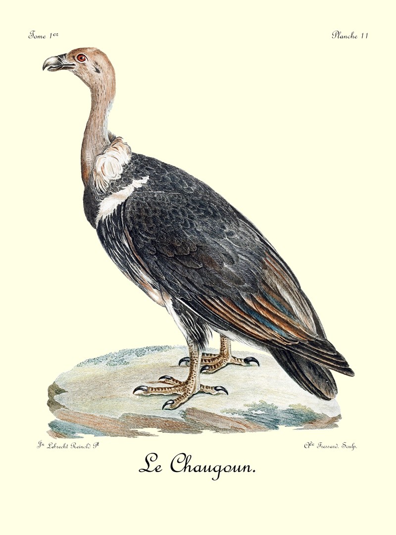 Tout le plumage du Caffre est d’un noir mat, à l’exception de quelques reflets brunâtres dans les petites couvertures des aîles, vers les pennes de l’aîle. L’œil, qui est très-grand, s’enfonce profondément dans l’orbite; et l’iris est d’un brun maron. Le bec est bleuâtre à sa base, et jaunâtre dans toute la partie de sa courbure. Les ongles sont noirs et les doigts d’un jaune terne. Je n’ai rencontré ces oiseaux que dans le voisinage de la Caffrerie, où ils sont même assez rares. Je n’ai vu en tout que cinq individus de cette espèce, du nombre desquels il ne m’a été possible d’en tuer que deux, qui vinrent se précipiter sur les débris d’un buffle, que j’avois fait jeter à l’écart pour les attirer. En les écorchant, il s’exhala de leurs corps une odeur insupportable; ce qui prouve qu’ils font leur principale nourriture des cadavres qu’ils rencontrent. Comme les vautours, ils sont obligés de marcher quelques pas avant de pouvoir s’enlever de terre; mais ils ne volent point en grandes troupes, car je ne les ai jamais vu que deux ensemble, apparemment le mâle et la femelle. N’ayant tué que deux femelles, je ne puis indiquer la différence qui se trouve entre les deux sexes. Je n’ai pu rien apprendre de particulier sur leurs habitudes et leurs pontes; les Sauvages m’ont assuré seulement qu’ils nichent dans les rochers; qu’ils attaquent les agneaux, les dévorent sur la place, et que jamais ils n’emportent leur proie dans leurs griffes, même quand ils ont des petits. Nous savons que l’aigle porte, de cette manière, la sienne dans son aire, pour la déchirer et la partager ensuite à ses aiglons. Le vautour, au contraire, n’apporte à ses petits leur nourriture que dans son jabot, d’où il la dégorge ensuite. Voilà du moins 30 une observation que j’ai faite plusieurs fois sur l’espèce que les colons du Cap nomment stront-vogel (oiseau de merde), ou aas-vogel (oiseau de charogne). Il y a même lieu de croire que c’est là généralement l’usage de tous les vautours; car leurs griffes ne sont pas propres à empoigner ni à serrer fortement.