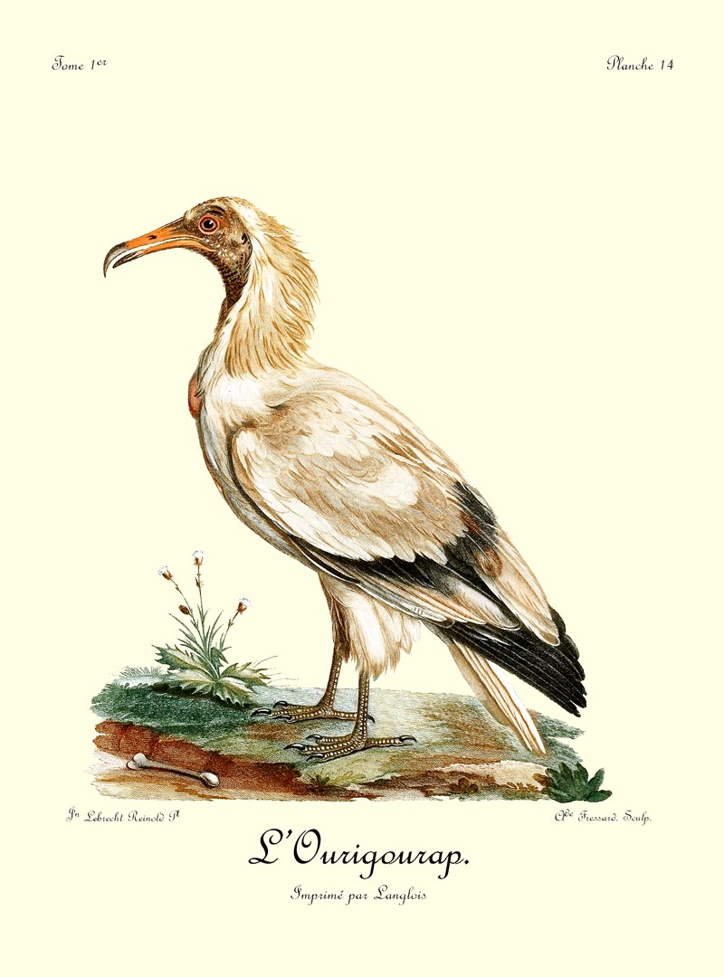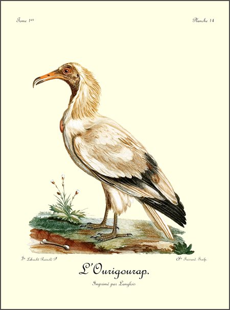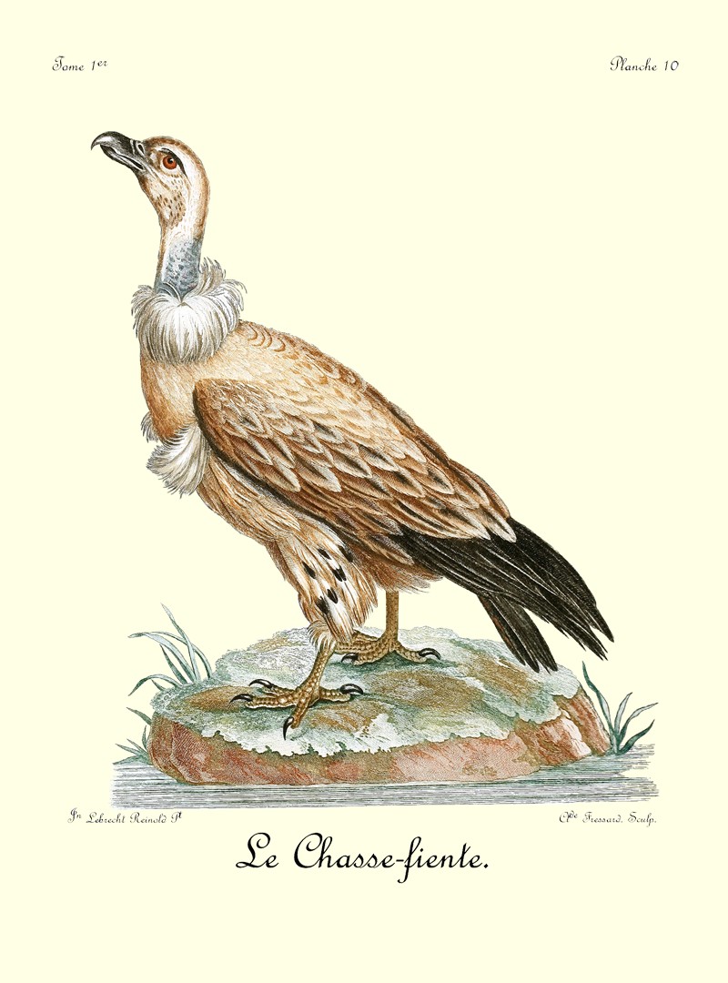Il arrive souvent que des bandes de vautours et de corbeaux, se réunissant, cherchent à saisir le moment favorable pour s’emparer de l’animal que vient d’abattre le Griffard; mais la contenance intrépide et fière de cet oiseau posé sur sa proie, suffit pour tenir à l’écart cette légion de carnivores.